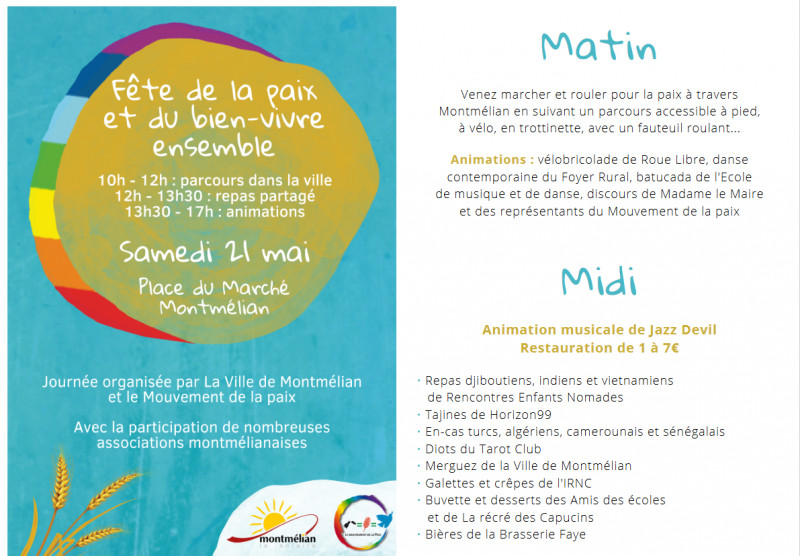 Organisée par la Ville de Montmélian et le Mouvement de la paix, la Fête de la paix et du bien vivre-ensemble aura lieu à Montmélian le samedi 21 mai 2022 de 10h à 17h.