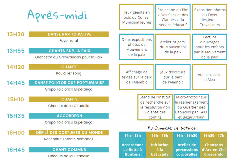 L'après-midi, vous pourrez participer à de multiples activités proposées par des associations locales (flash mob, danse de rue, danse folklorique, chants sur la paix, défilé des costumes du monde, jeux géants en bois, ateliers artistiques, expositions de photos et de textes, projection de film...)