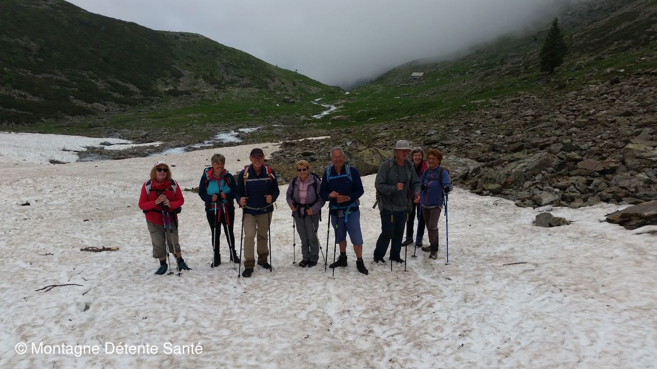 Partis le matin de la Ferrière nous avons mangé à midi au refuge (1784m) avant d’aller faire la photo de groupe sur le névé du fond de la combe.