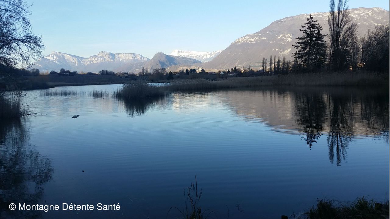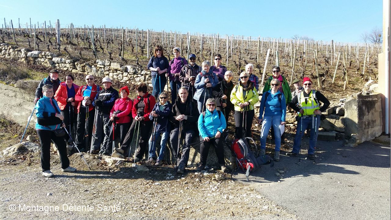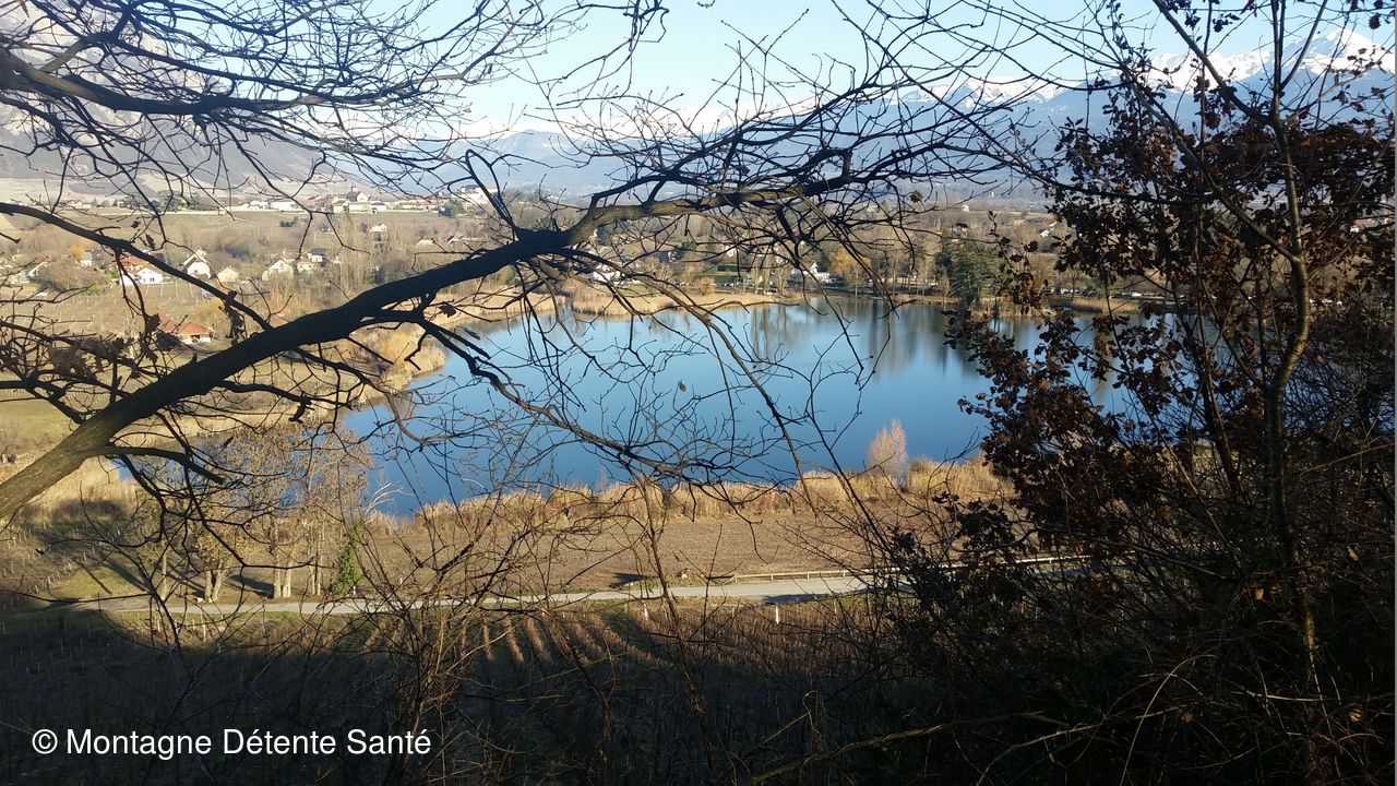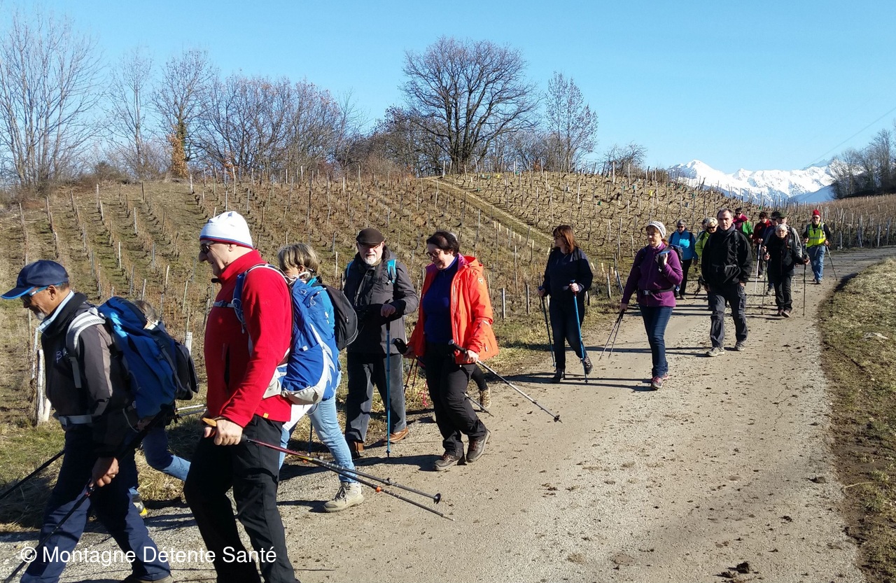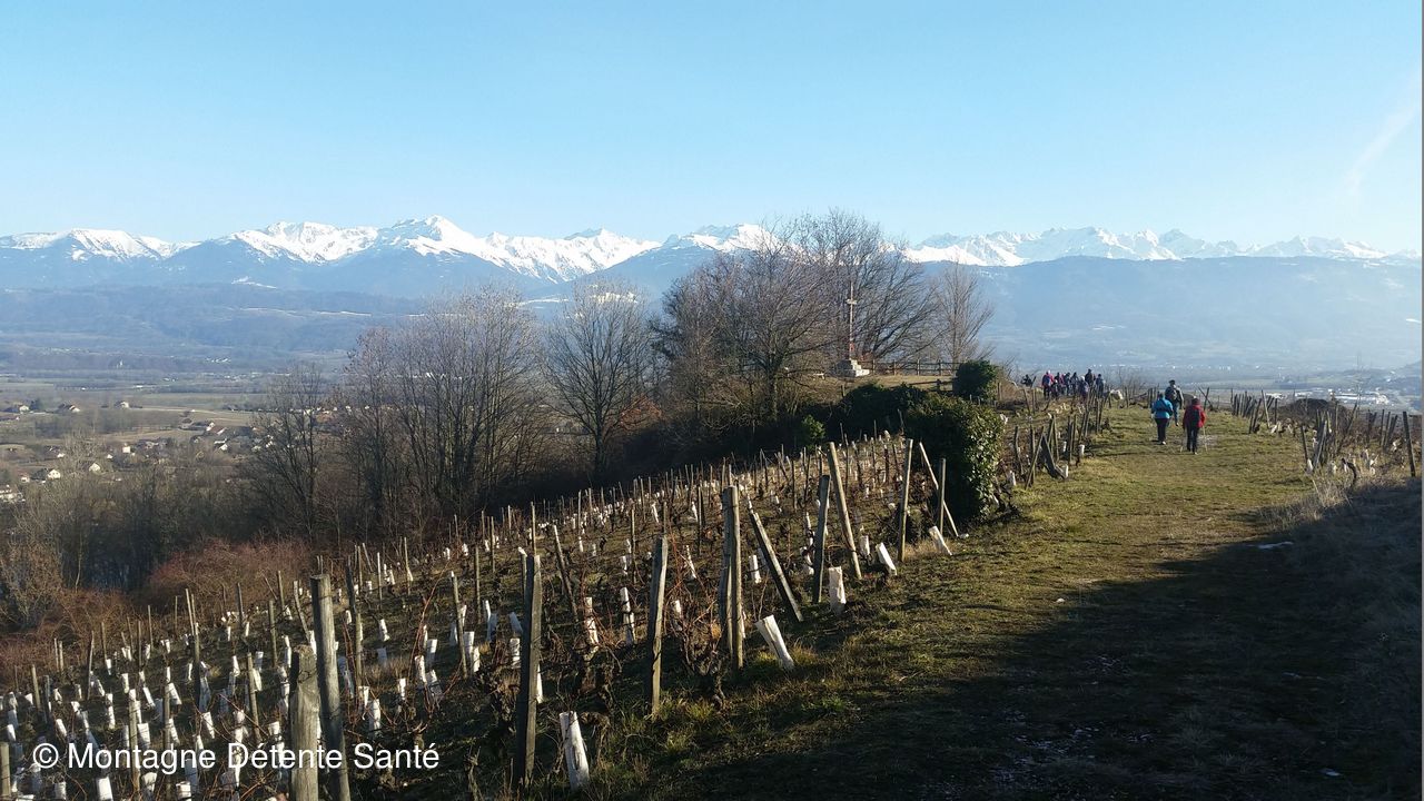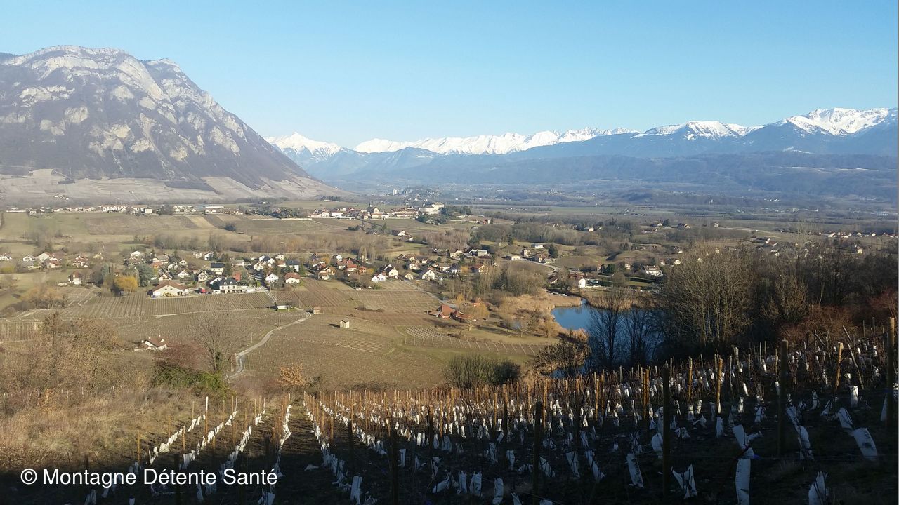Nous avons parcouru les vignobles des Abymes dans les éboulements du Granier avec une vue magnifique sur les sommets enneigés de Belledonne de la Lauzière, des Bauges, de la pointe sud du Jura.