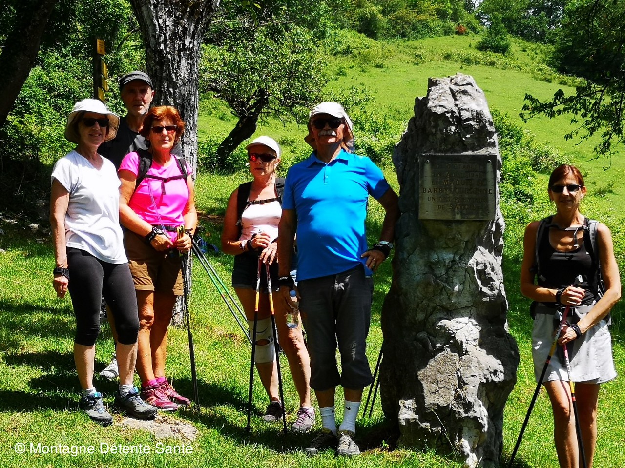 Nous commençons notre séance du parking de l'église de Curienne en effectuant les échauffements musculaires en marchant. Nous empruntons le chemin de la roche où l'on peut voir les vestiges de ce que fut l'exploitation de la roche grise de Curienne puis par le chemin des Fontanettes pour redescendre vers la D11 que nous suivons pendant 500 m jusqu'à "la Paraie". De là, nous prenons la direction de la "Ferme des Résistants" où trône la stèle du maquis. Le chemin est en sous-bois, ce qui est appréciable en période de forte chaleur. Arrivés là, nous prenons le temps de nous désaltérer et de poser pour une photo. Nous repartons pour affronter la remontée vers le Col du Joueret (300 m d'un bon dénivelé). Nous contournons la "Motte Castrale" par le large chemin jusqu'au panneaux directionnels et prendre celui qui serpente en sous-bois et remonte jusqu'à la "combe du puits" et jusqu'au "Mont Saint-Michel". Nous prenons le temps d'admirer le magnifique panorama sur les vallées et les chaines de montagnes, faire une photo et boire.