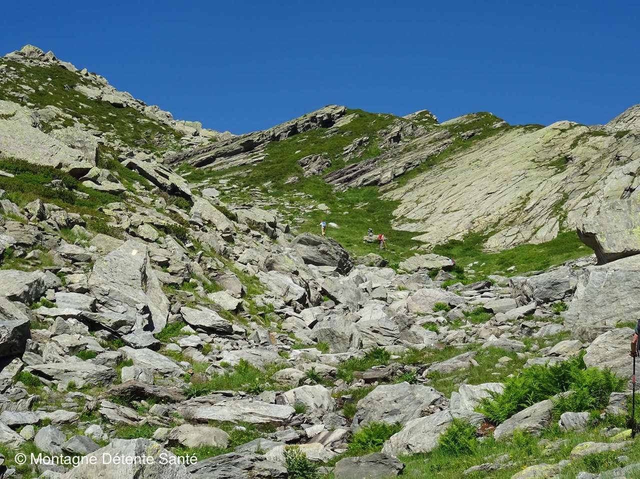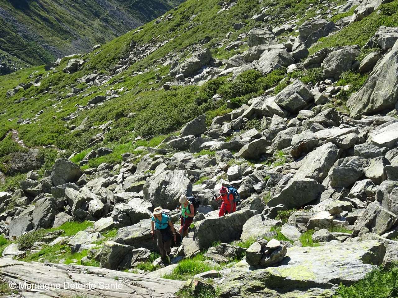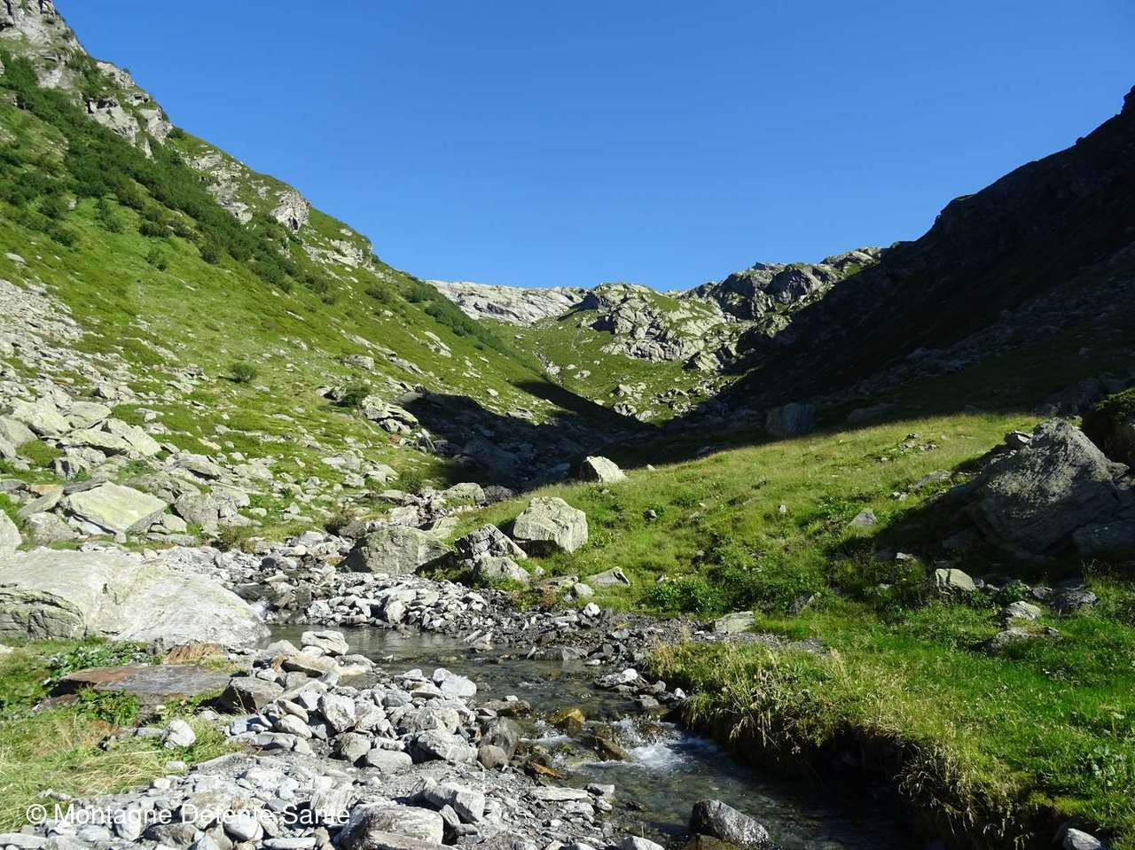 a travers les pierriers et traverse à plusieurs reprises le torrent.