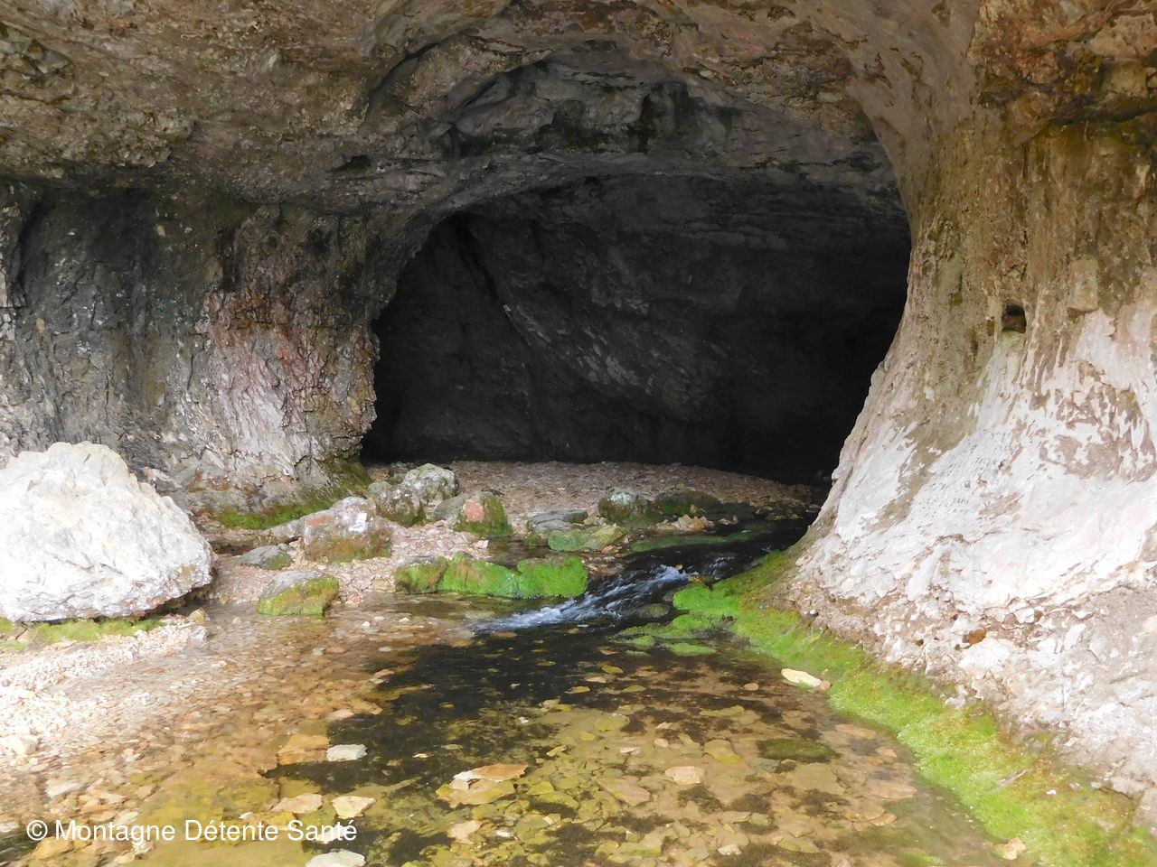 En prenant une autre montée un peu plus raide cette fois, on accède au pied d’une grotte de laquelle sort la rivière.