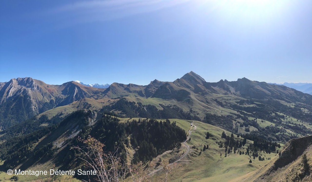 Arrivés en haut, panorama 360° sur les Aravis, le Mont Blanc, les Bauges, la Tournette et même au loin la Grande Casse et les Ecrins. Pause pique nique et descente au travers des alpages jusqu'au col de la Botte et retour aux voitures via les Pézières et le Crêt Vermant.