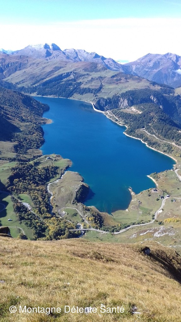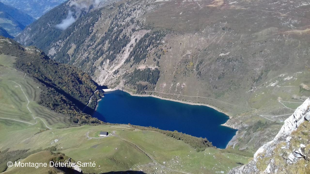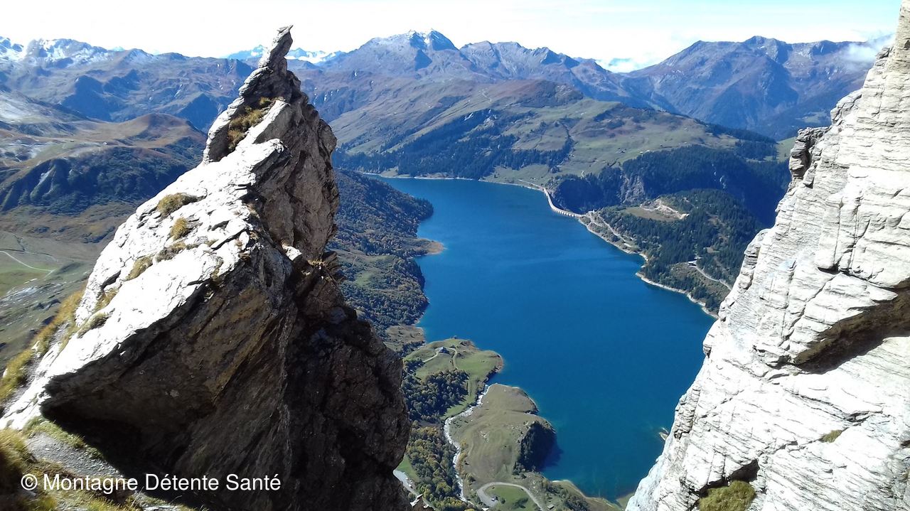 Les rayons du soleil nous réchauffent et la grimpée vers le chalet de la Lauze aussi. Nous poursuivons vers le tunnel que nous traversons à la lampe frontale pour déboucher au pied du Roc du Vent avec une vue superbe sur les barrages de Roselend et de la Gittaz. Le sentier en balcon un peu aérien nous mène au pied du col de la Lauze. Dernière grimpette pour rejoindre la crête du Roc du Vent et l'entrée du canyon où nous découvrons que le névé «éternel» n'a pas résisté à la canicule estivale.