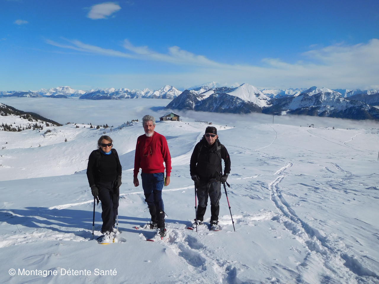 Bien leur en a pris puisqu’en fait d’ascension dans les nuages, se fut une montée au soleil avec un magnifique ciel bleu au-dessus de nos têtes, surtout après la place à Baban. Et la neige était au rendez-vous là haut avec une trentaine de centimètres qui ont nécessité les raquettes. Belle trace à faire jusqu’à l’arrête puis rencontre de randonneurs à ski qui se faisaient plaisir eux aussi. Le vent, très léger aujourd’hui avait quand même soufflé une partie de la neige et la progression jusqu’au mat s’en trouva facilité.