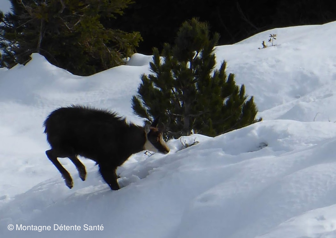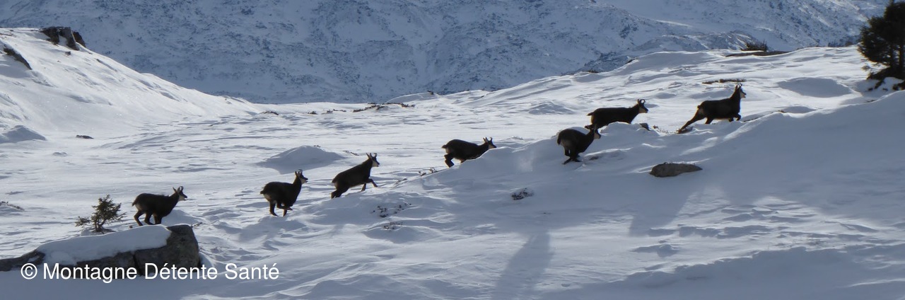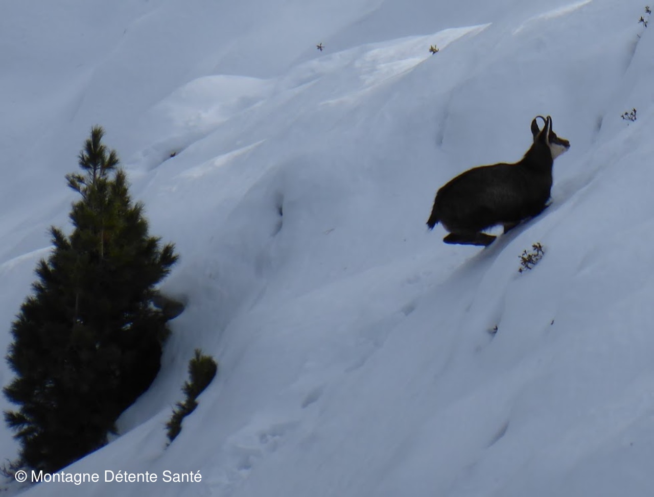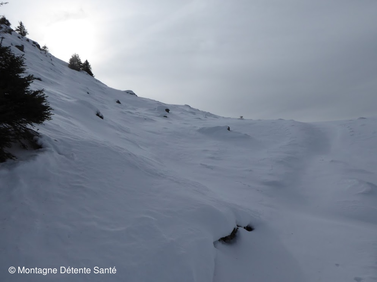 Départ depuis le hameau de Béranger, puis les Dogettes, l'Arpette, le dos de Crêt Voland. Nous avons dû chausser les raquettes un peu en dessous du dos de Crêt Voland pour ne plus les quitter jusqu'à pratiquement l'arrivée. Neige croutée qui ne porte pas. Ensuite, parcours sur les crêtes, panorama à 360°, observation de plusieurs hardes de chamois et montée au roc de fer où nous avons pique-niqué à l'abri du vent. Puis, descente en direction de Cacabeurre, Catagne, Goffay et retour à la voiture.