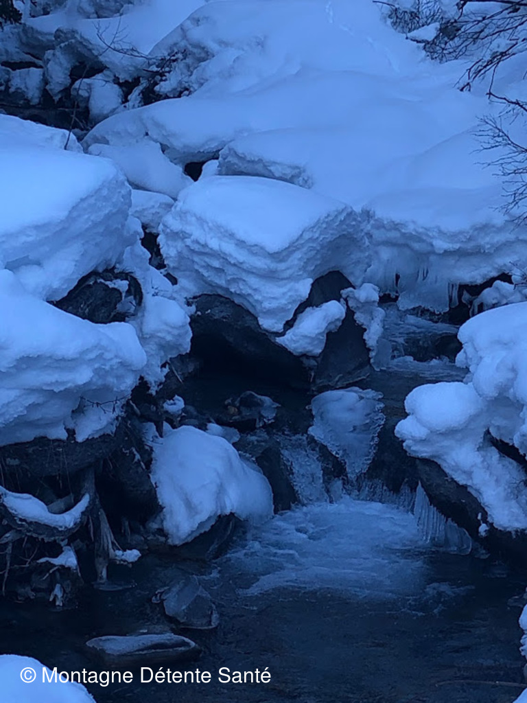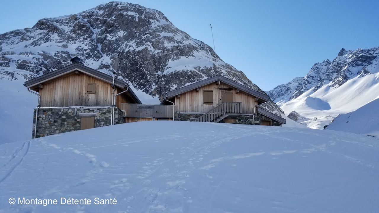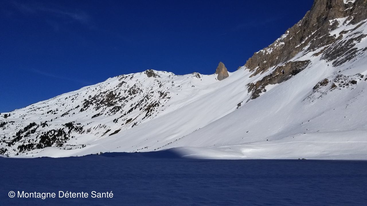 Température proche de 0. Début de la randonnée au le lac de Tueda gelé puis, passage devant le chalet du Frui , chalets de la Plagne et montée par le Vallon du Fruit jusqu'au refuge du Saut, l'objectif de notre rando.