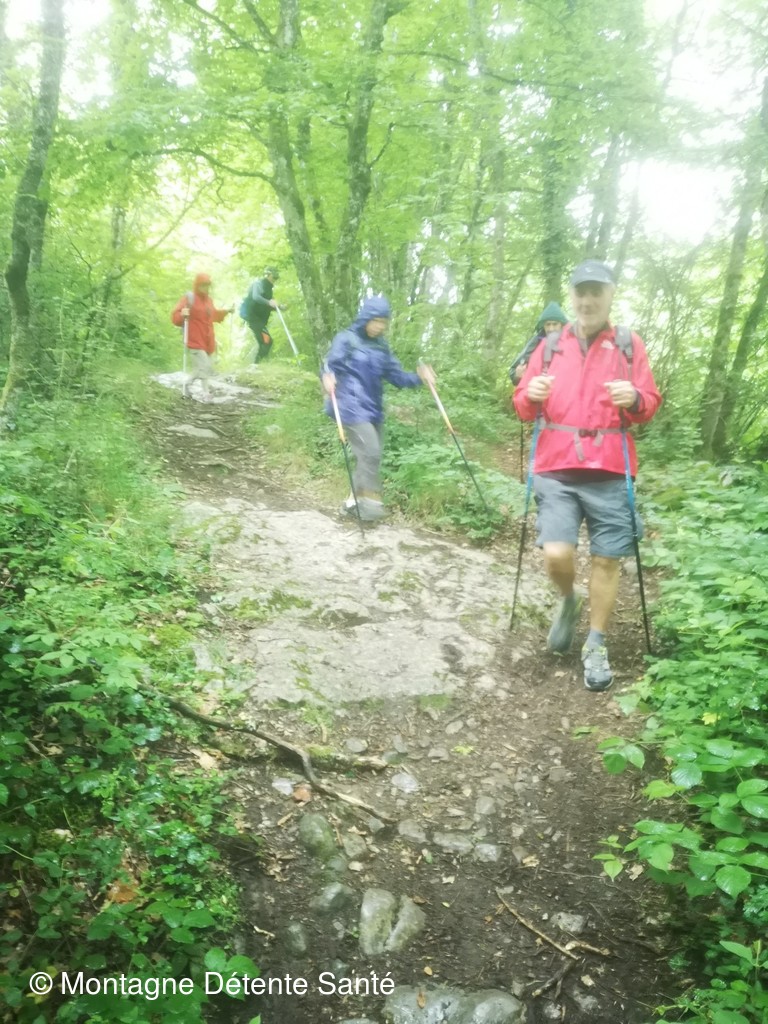 Nous pensons encore pouvoir finir notre séance en passant à travers les gouttes mais il devait en être autrement. Nous prenons la direction de Montmerlet et retournons vers notre point de départ par le GRP du massif des Bauges. C'est donc sous la pluie que nous terminons les 20 dernières minutes de marche.