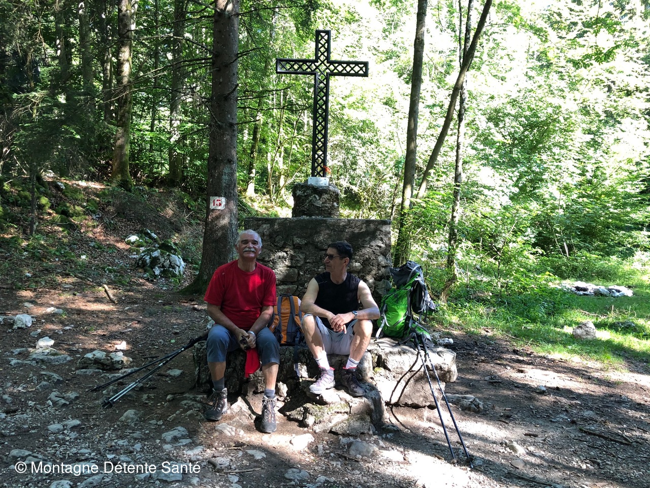 Montée sans souci par l'ancienne voie sarde qui garde en certains endroits son pavement d'origine et ses murs de soutainement jusqu'au Col du Crucifix (915 m) pour la pause. Recherche des vestiges de la station du Télégraphe Chappe sur la ligne Lyon-Venise qui correspondait en venant de France avec la station de Miribel Les Echelles et poursuivait en Savoie par la station de La Roche du Gué de 1805 à 1815.