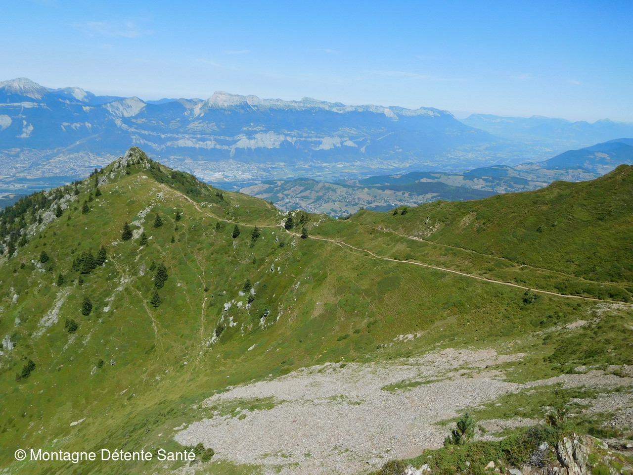 Superbes vues à 360° depuis le sommet, soit vers Chartreuse et Vercors, soit face à la majesté du Grand Pic de Belledonne avec le Mont Blanc là bas tout dans le fond.