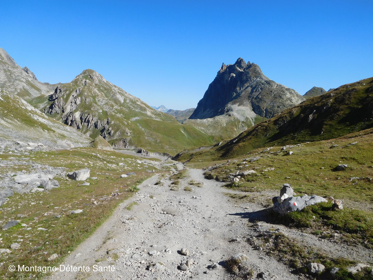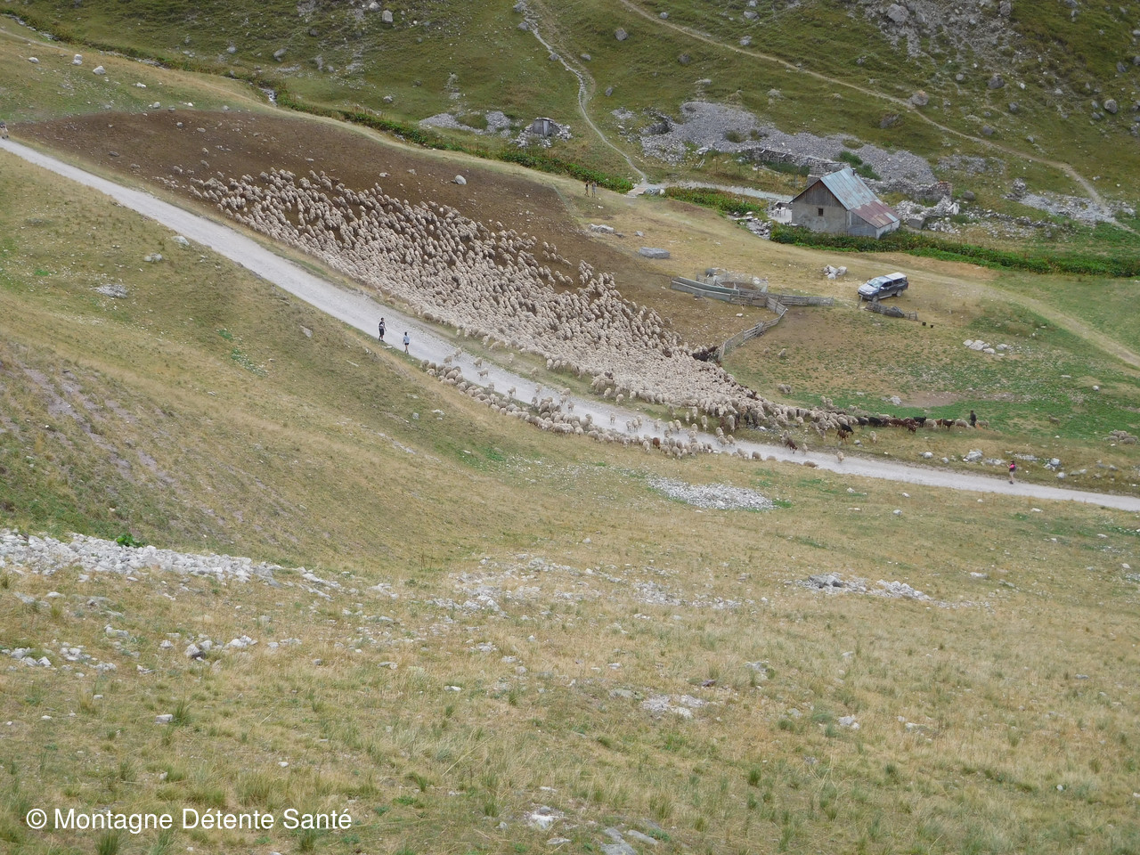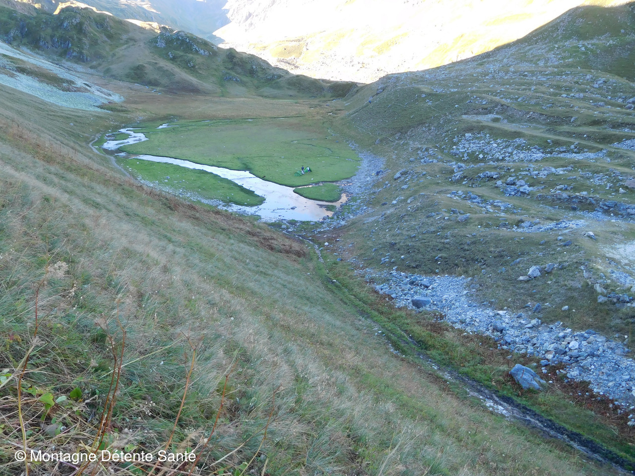 Départ à la fraîche pour arriver au lac des Cerces avec le soleil. Petite pause pour apprécier ce premier lac avant de passer le col des Cerces. Malgré la saison avancée, il y a encore pas mal de fleurs à cette altitude. Puis, descente vers les autres lacs. Tout d’abord le lac Rond aux reflets tantôt bleus, tantôt verts, selon que le ciel ou la montagne s’y réfléchit. Une légère brise fait s’onduler sa surface. Passage de la frontière après le Seuil des Rochilles dans un dédale de pierres avant de descendre vers le lac de la Clarée. Un peu trop de gens à notre goût et nous prenons un peu d’altitude pour avoir une vue plongeante inhabituelle et du coup rester là pour le casse croûte, lequel se poursuit par une petite sieste avant de reprendre le chemin du retour par le lac du Grand Ban, camp des Rocailles et retour au parking en passant près d’un parc à moutons pour admirer le travail du chien de berger qui guide son troupeau en quelques jappements et une rapidité surprenante.