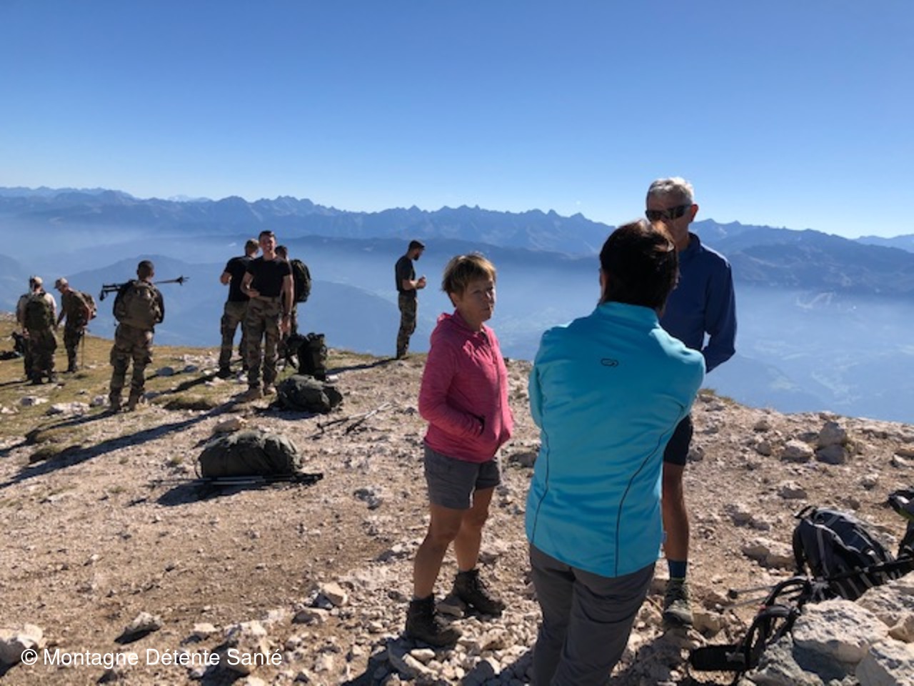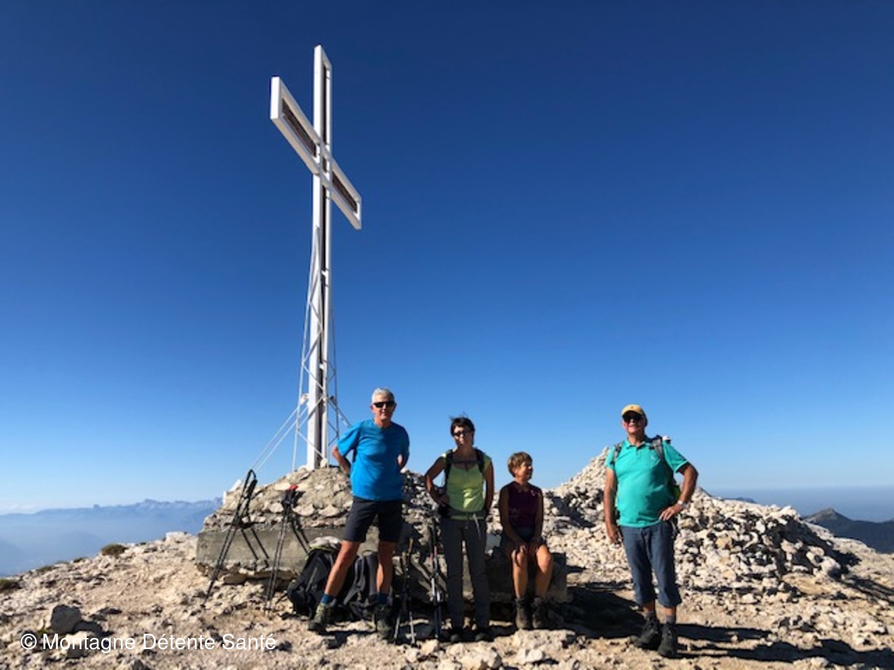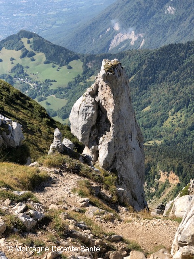 Nous traversons l'immense plateau incliné à travers les lapiaz et autres grouffres pour atteindre après une longue montée la Croix de Crolles en bordure de la falaise Sud à 2 062 m. Il est midi, nous attendent à défaut de chamois et de bouquetins, les choucas et les amateurs de parapente, complètés, à quelques minutes de notre arrivée, d'un bataillon de chasseurs alpins en exercice arrivant par un autre chemin. Toutefois nous profitons de ce panorama grandiose pour égrainer le nom de toutes les montagnes reconnues.