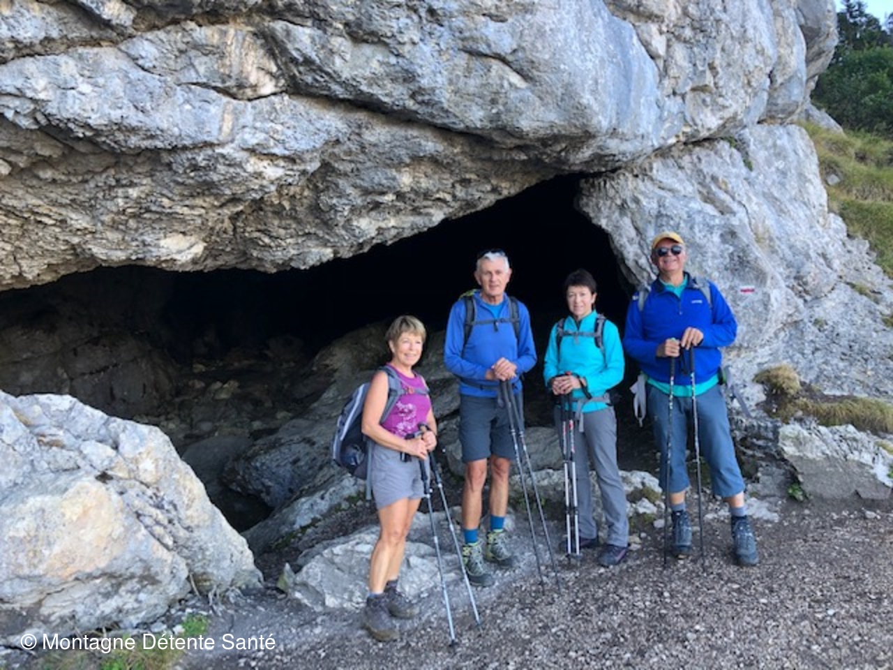Arrivé au Col des Ayes (1 538 m) au lieu-dit l'abreuvoir où coule une source alimentant 4 bassins pour le bétail, nous poursuivons à l'ombre de la montagne notre montée par une succession de lacets jusqu'à un carrefour à 1 600 m où nous choisissons l'itinéraire de la montée par le Trou du Glas. Il suit la falaise Nord de la Dent pour atteindre après une courte descente l'entrée de la grotte du Glas, l'une des entrées du célèbre réseau souterrain où suinte le bruit étrange d'une cascade souterraine. Mais n'étant pas venu pour faire de la spéléo, nous poursuivons par l'attaque de la périlleuse montée du Glas : le chemin part dans la paroi par une succession de passages câblés, de cheminées demandant de mettre les mains et de 2 étroites failles dont celle des blocs coincés pour nous permettre d'atteindre enfin le plateau sommital (1 780 m).