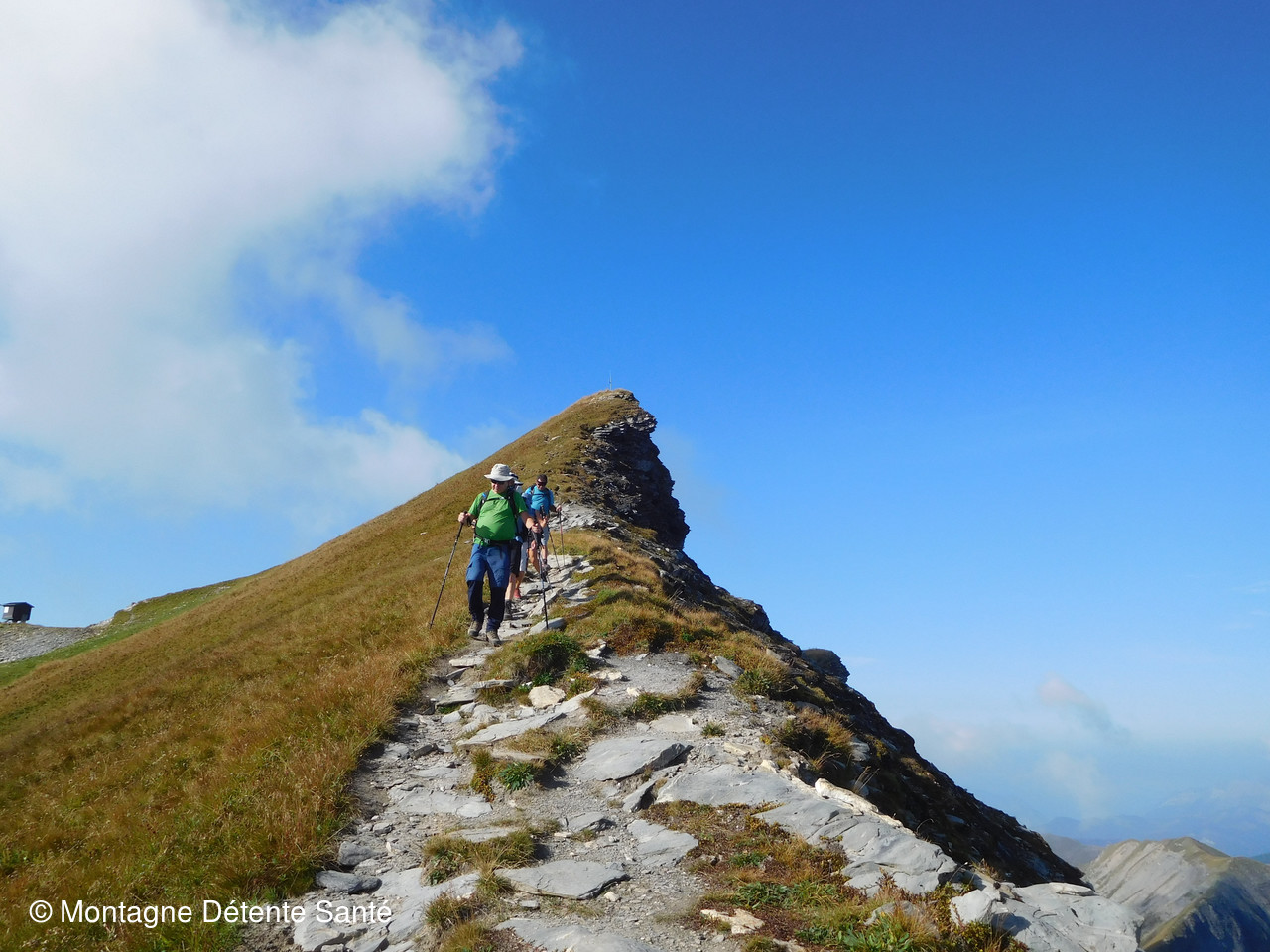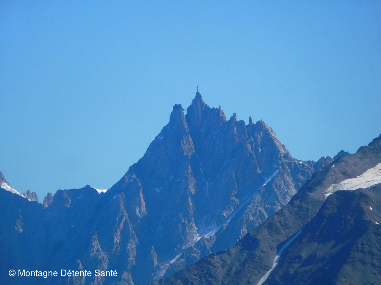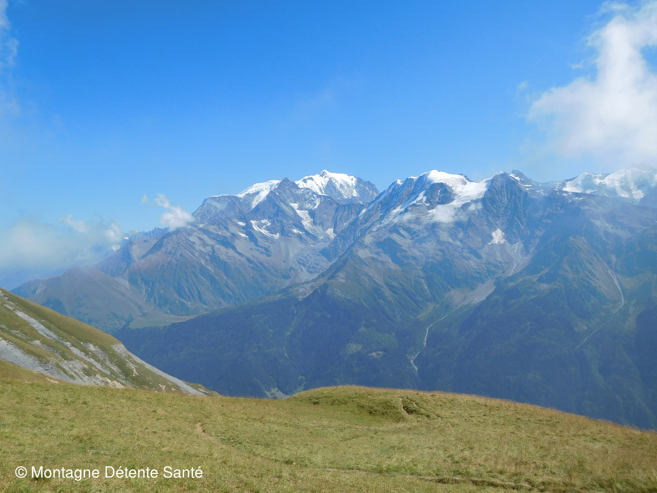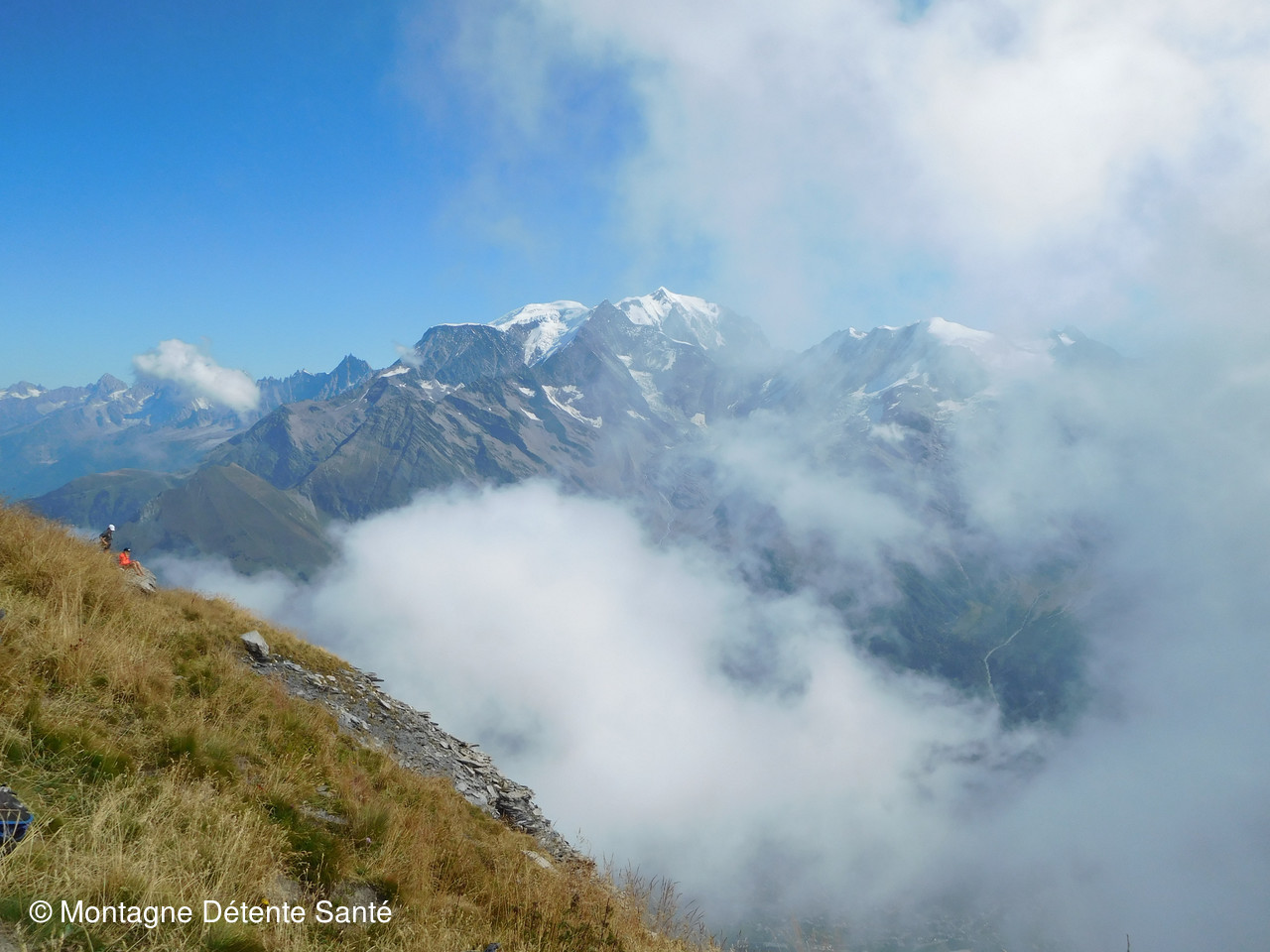 Magnifiques panoramas à gauche, à droite devant ou derrière, dont on ne se lasse pas. Pour la photo de groupe, le Mont Blanc a joué les timides et n’a pas voulu sortir du nuage, tant pis…