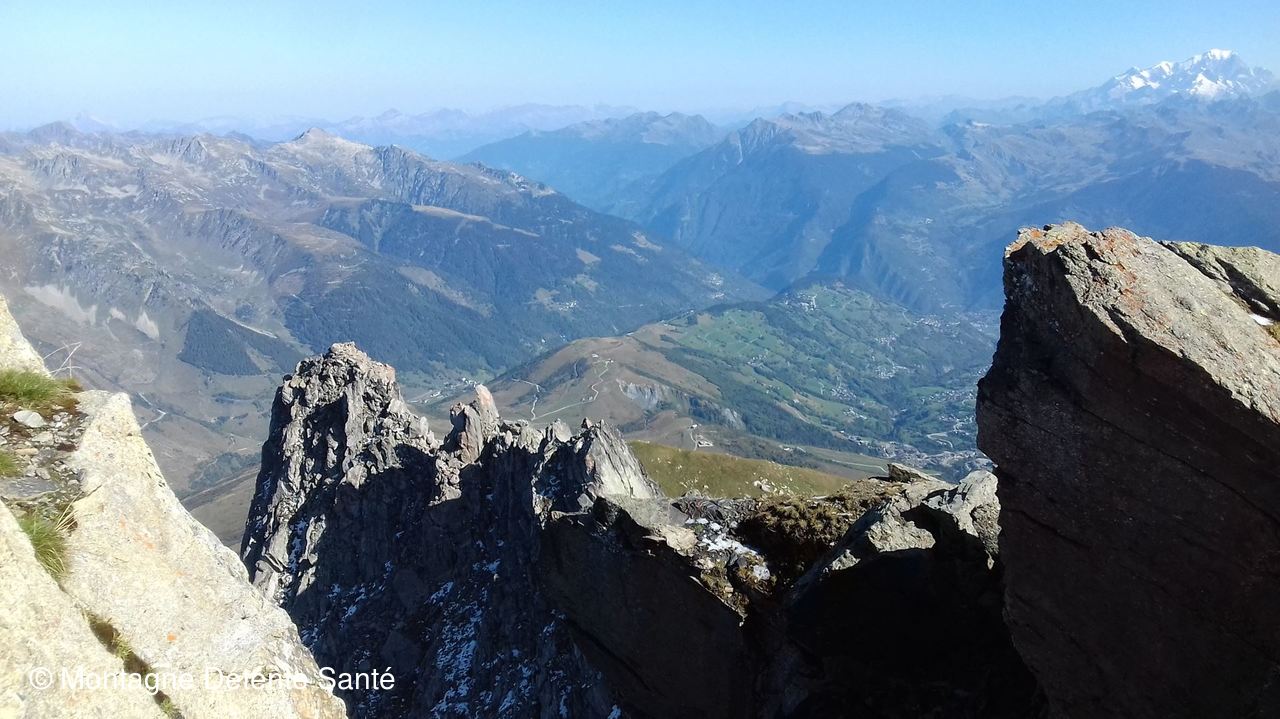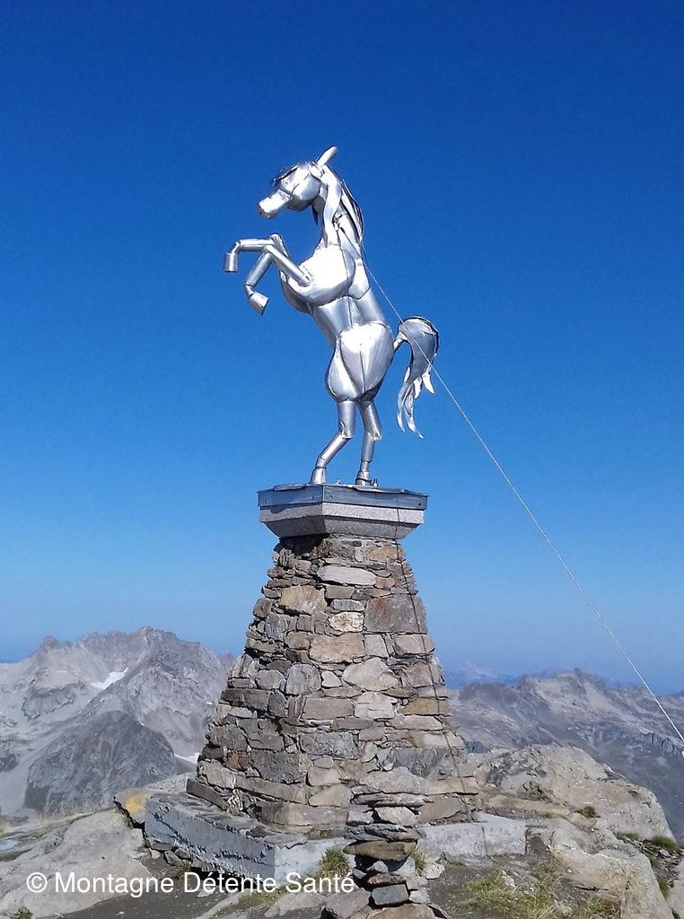 2 stations Saint François Longchamp et Valmorel. Nous poursuivons en direction du col du Cheval Noir par un sentier bien marqué dans les alpages et nous poursuivons notre montée dans des pierriers jusqu'à l'arête. Petite pose pour adminer le paysage et nous continuons notre progression jusqu'au sommet du Cheval Noir avec un magnifique panorama à 360°. La statue du cheval cabré se dresse sur un piedestal en pierre .