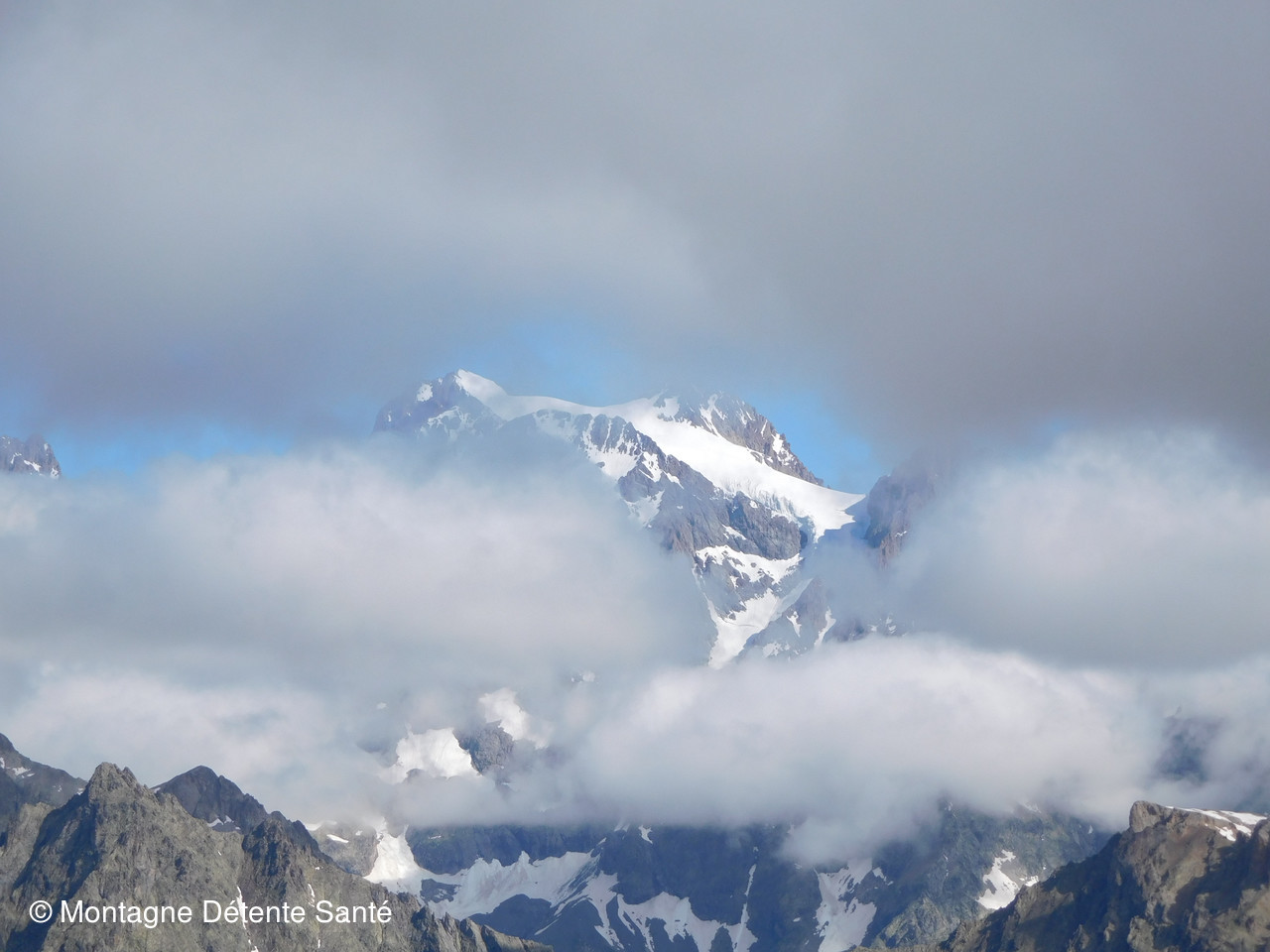 Belle vue sur cette partie des Ecrins, l’Aiglière n’est pas encore sortie des nuages, le Pelvoux non plus d’ailleurs.