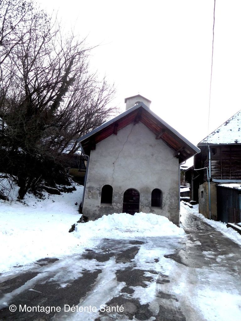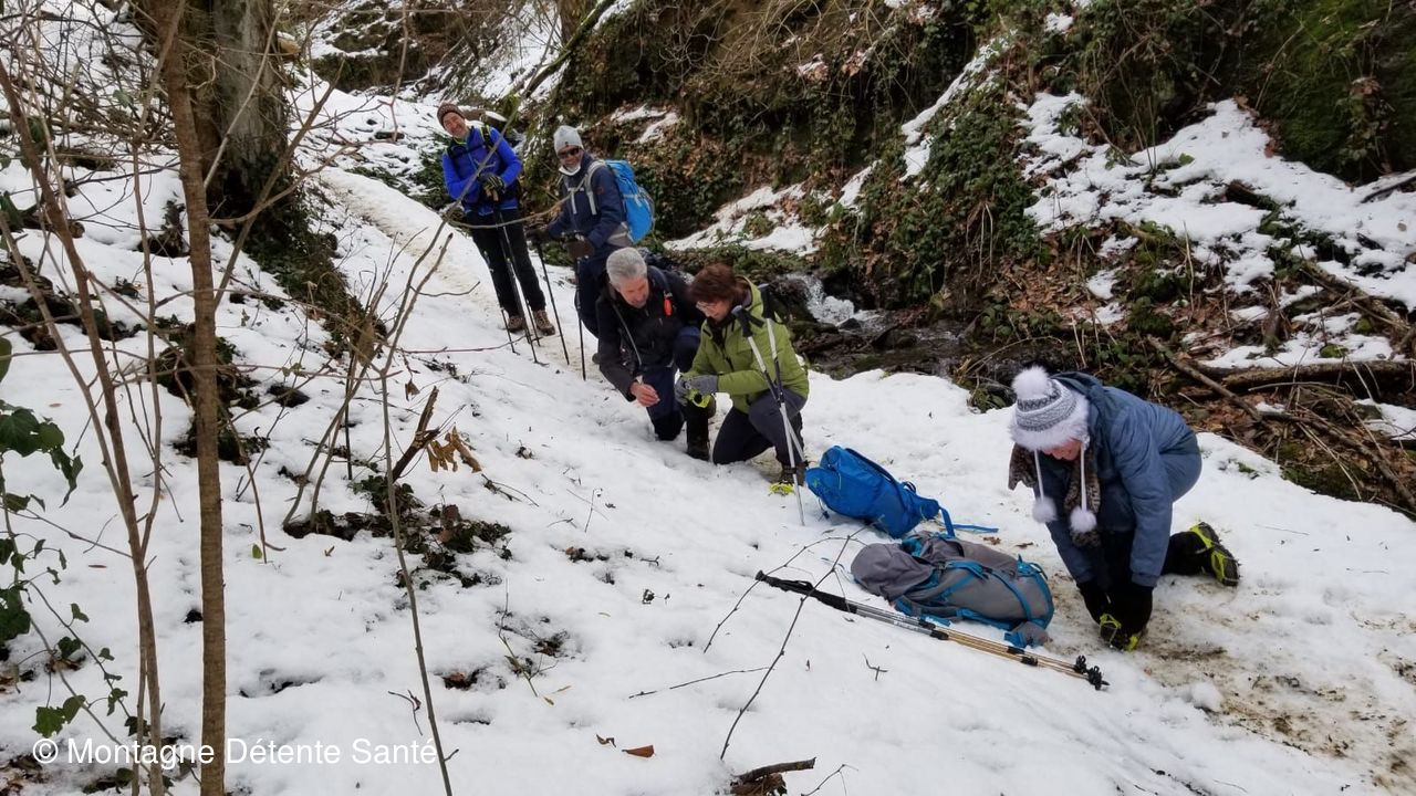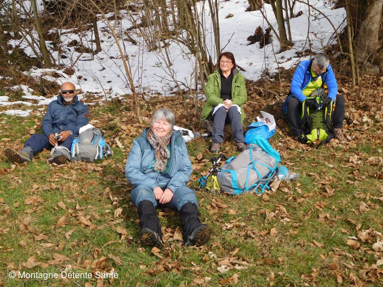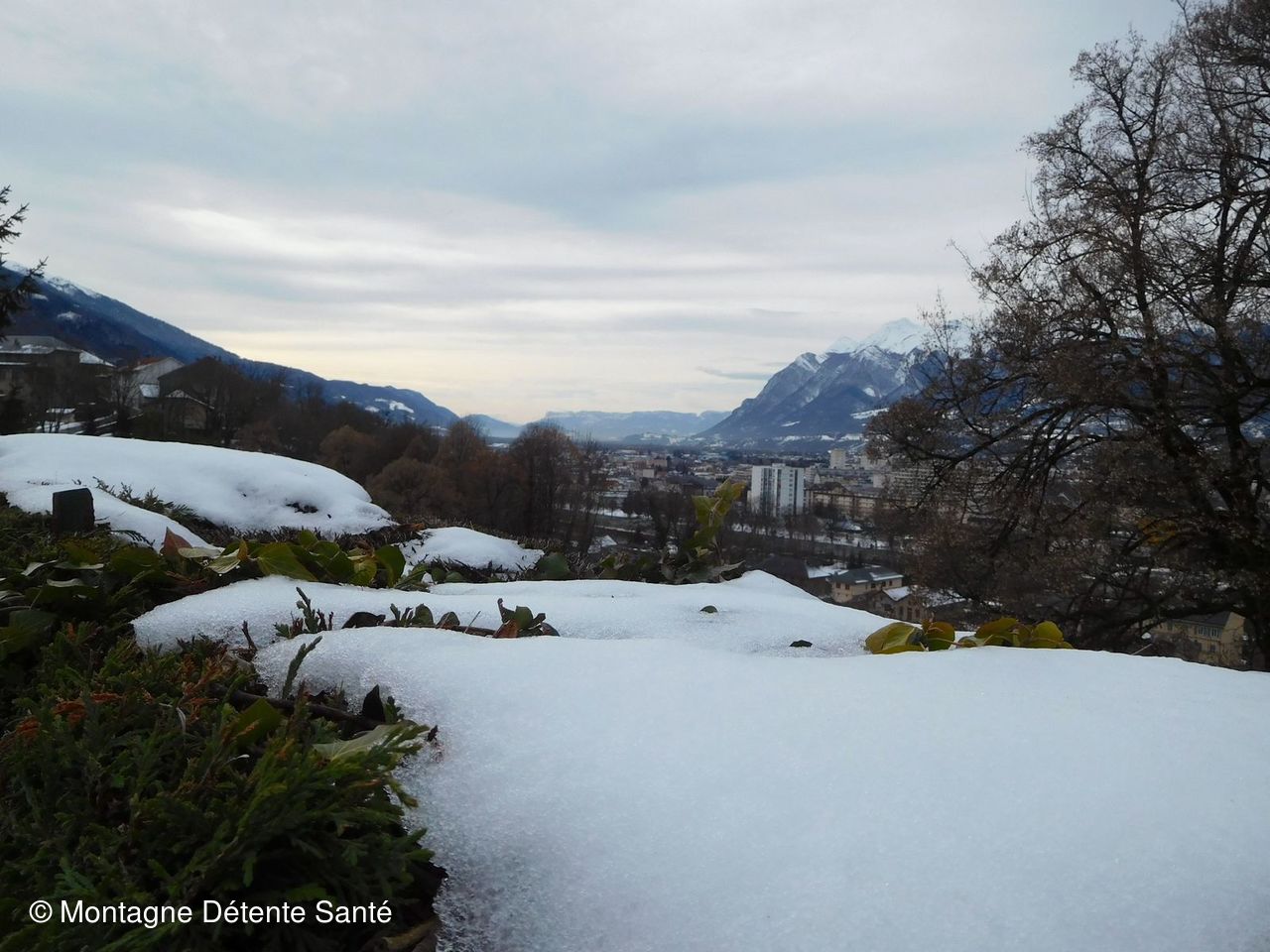 Partis du parking à l’entrée de la cité médiévale, le cheminement se fait à travers escaliers et ruelles pour passer derrière l’église et arriver sur le sentier de le Poterne des Vignes qui rejoint Farette. De là, à travers les prés recouverts d’une belle couche de neige, il amène sur la route du Fort du Mont. Casse-croute rapide puisque le soleil nous boudait aujourd’hui avant de redescendre par un beau sentier enneigé mais pas trop glissant vers le Pommaray et la Forezat et enfin retour à Conflans.