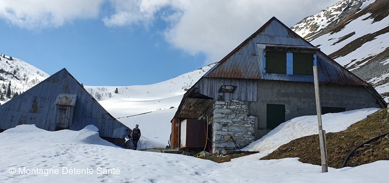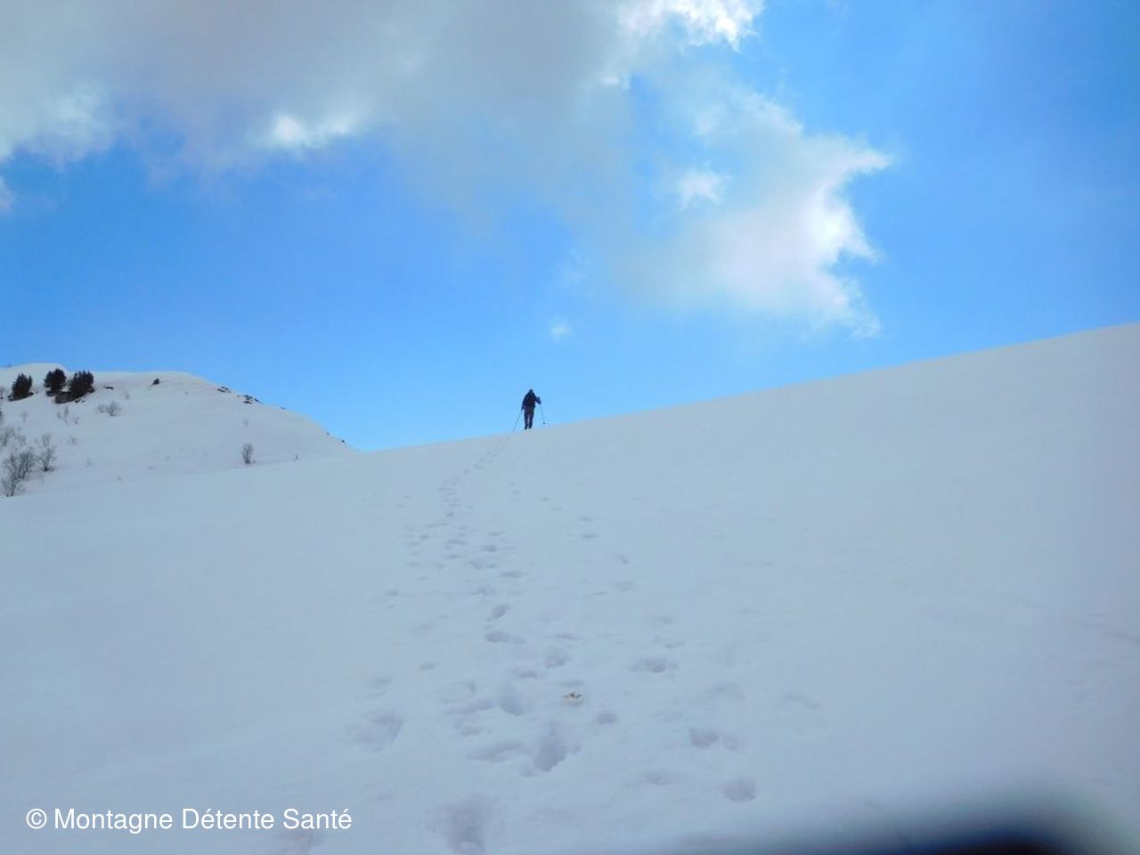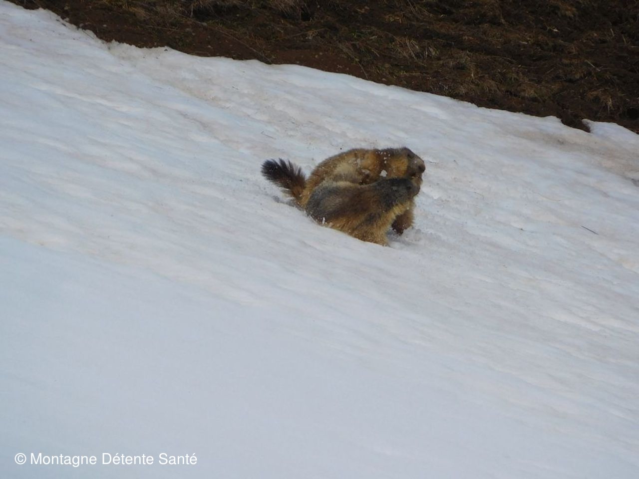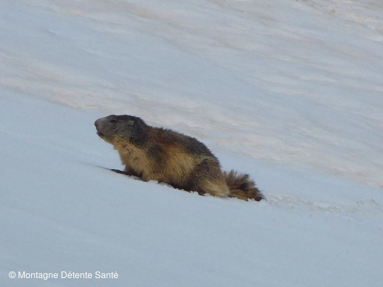 La douce montée se fait facilement et les Chalets des Arbets sont rapidement atteints, la neige n’ayant jamais été un obstacle. Nous décidons de poursuivre un peu vers quelques rochers pour le casse croûte. Nous regardons deux skieurs qui grimpent sur le Grand Para en vue d'une belle descente bien raide. Deux marmottes se chamaillent et viennent rouler dans la neige un peu au-dessus de nous. D’un commun accord nous poursuivons vers le col jusqu’à ce que la neige devienne gênante. Mais elle porte bien et nous voilà au Col. Les nuages sont accrochés sur tous les massifs si bien que l’on ne s’attarde pas et redescend un peu à travers tout, dans la neige fraîche de la veille, en évitant de repasser au même endroit qu’à la montée.