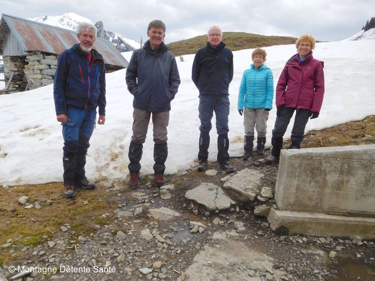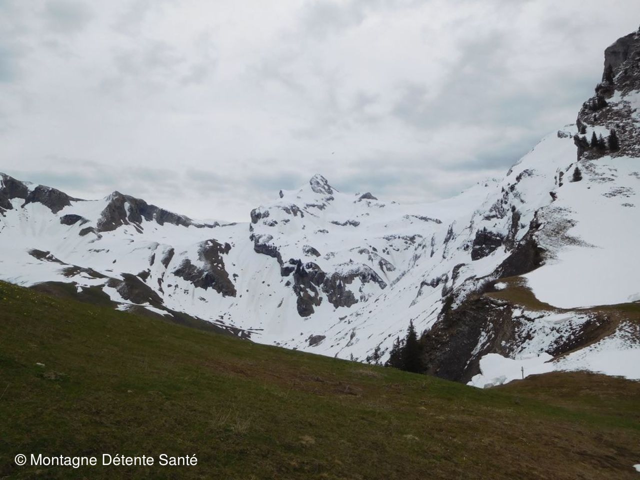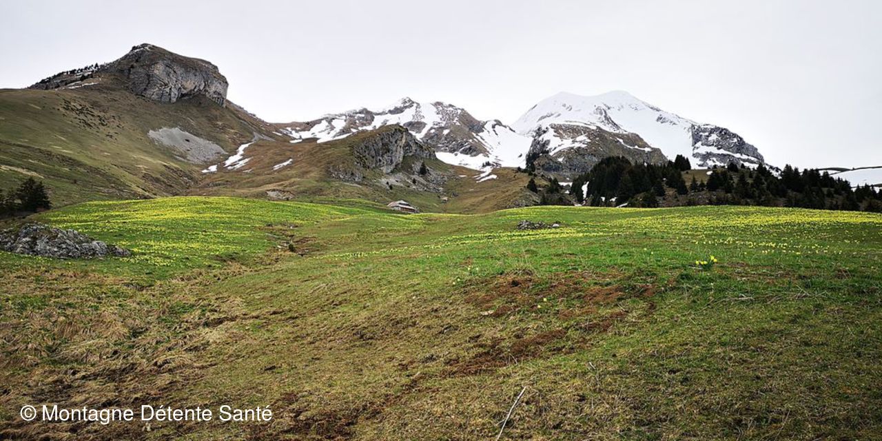 Petite descente pour traverser un torrent et remontée un peu raide vers les alpages qui nous emmène vers des prairies jaunes. Des jonquilles à perte de vue et en un tapis parfois dense dès 1300 m. Elles nous accompagneront quasiment jusque la Tête d’Orsière à 1750 m, surtout sur les pentes bien exposées. Mais en face nord, la neige est là, bien présente et les crampons seront utiles pour la descente. Un regard circulaire nous fait découvrir de très belles vues sur les sommets environnants, mais le vent et l’absence de soleil ne nous incitent pas à trop traîner. Repas au chalet du Macheux puis balade en suivant la piste à travers les alpages et de nouveaux les jonquilles, piste qui nous fait descendre puis remonter vers le Plan des Mouilles avant de redescendre au plus court vers le point de départ sous un ciel devenu bien plus clément.