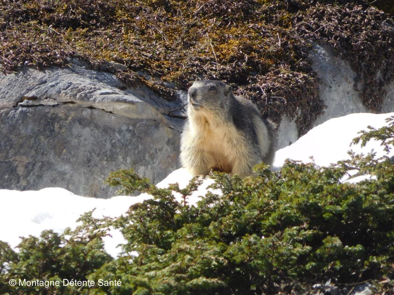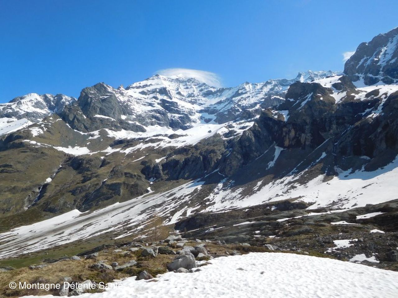 Un passage rendu un peu délicat par un névé vient pimenter la deuxième partie du trajet. Une pause s’impose au chalet de Derrière la Rèbe. Puis la neige est là, bien épaisse, tapissant tout le fond du vallon et à travers laquelle le torrent trace ses méandres. Elle porte bien et la progression est facile. Le gypaète du secteur passe près de nous dans sa quête de nourriture, les marmottes par dizaines vaquent à leurs occupations sans se préoccuper de nous. Il faut dire que nous sommes seuls dans ce magnifique vallon. Et, nous voici au lac pour le casse croûte. Un randonneur solitaire semble suivre l’itinéraire du GR5 là bas au loin.