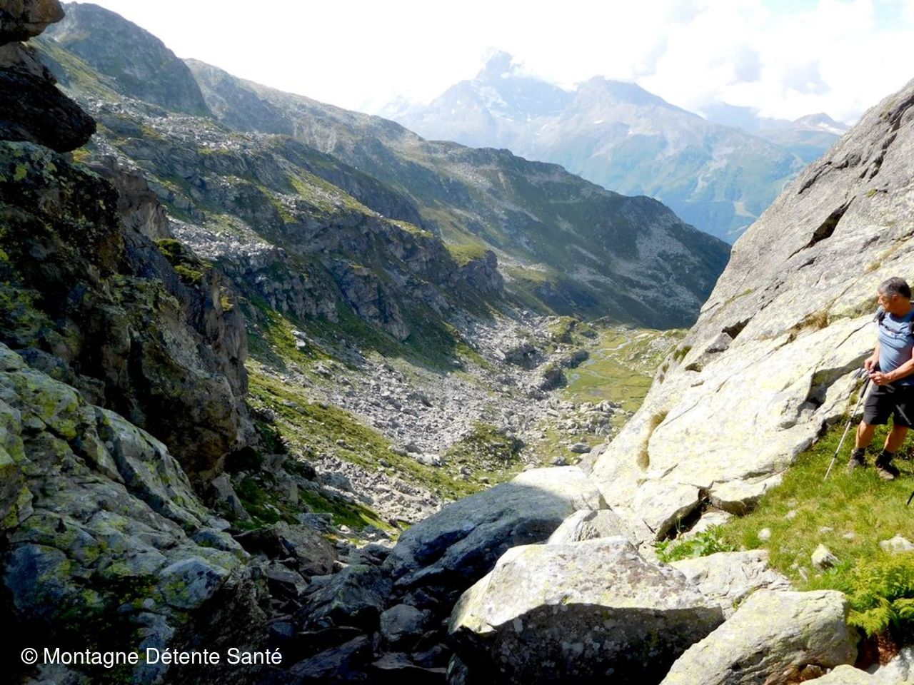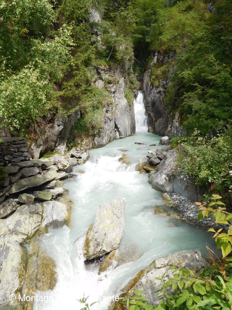 Casse croute sous un soleil masqué par un nuages gris qui ne semble pas vouloir perturber notre journée. Puis belle descente technique dans un pierrier avant de rejoindre le cheminement rive droite du torrent. Des groupes montent seulement maintenant. Ah ces touristes…