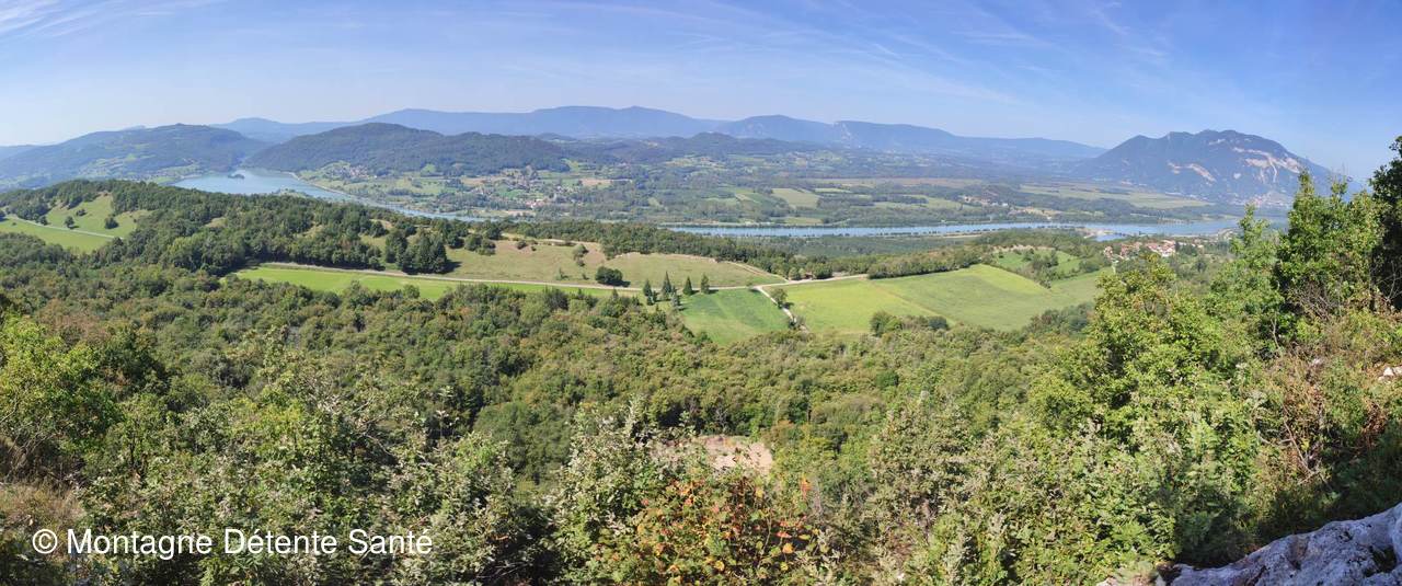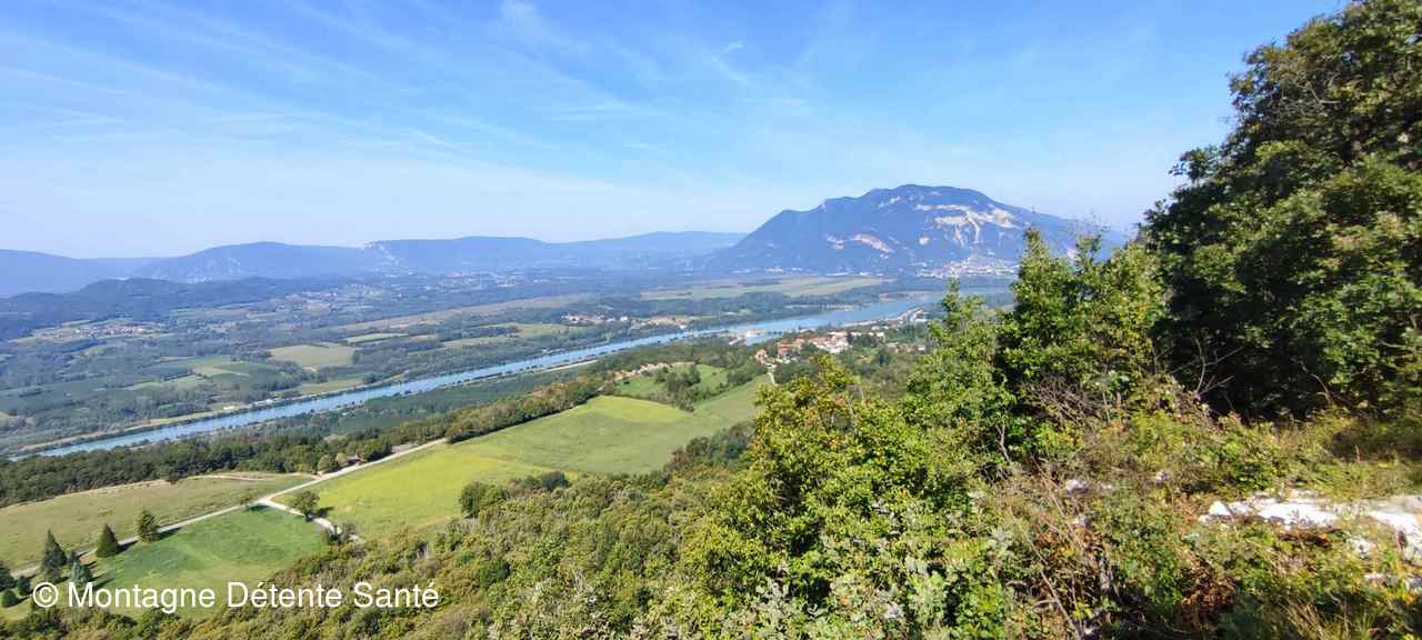 Depuis ce promontoire surplombant le canal de déviation du Rhône la vue est magnifique depuis le Grand Colombier au nord, les marais de Lavours, le Lac du Lit au Roi jusqu'à la montagne de Parves et Nattages au sud.