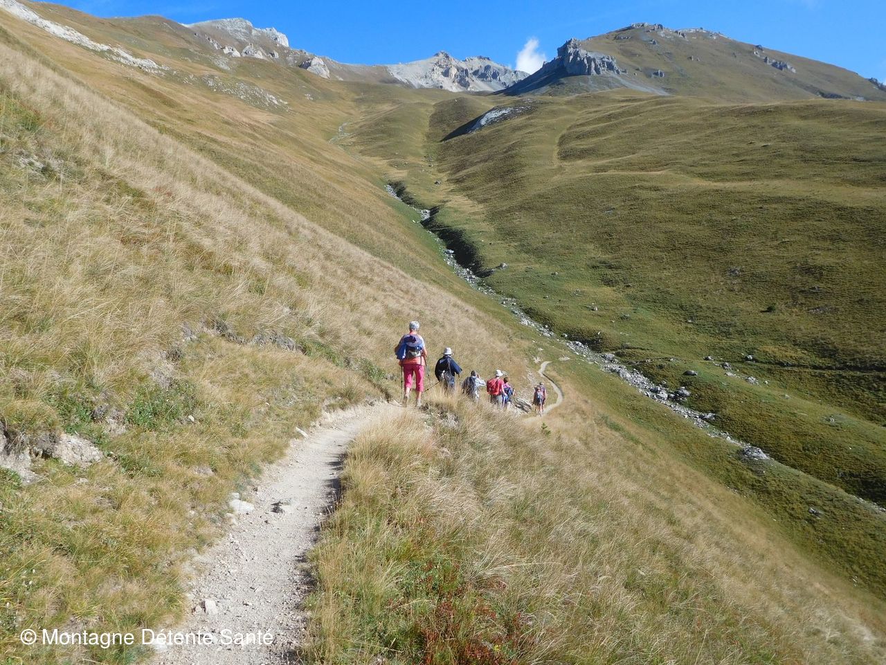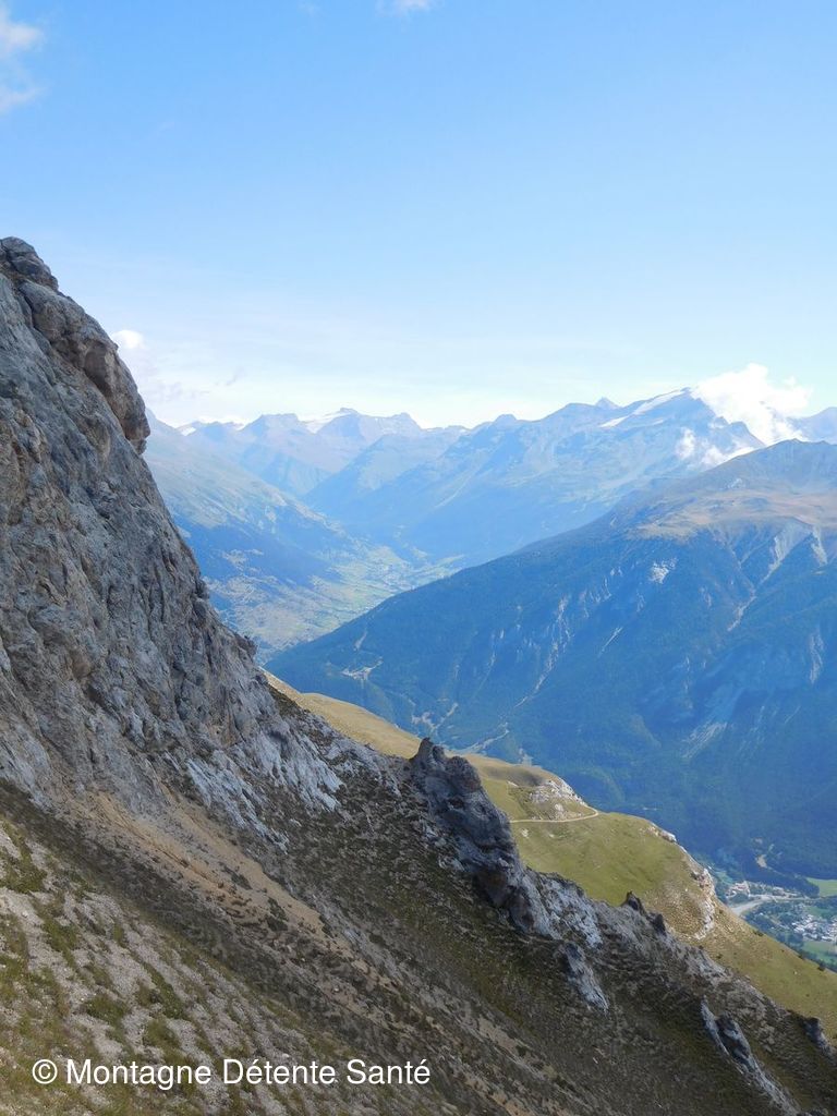 Depuis le barrage du Plan d'Aval (2000m) nous avons rejoint l'arrivée du télésiège (qui peut être une bonne solution pour gagner quelques centaines de mètres de dénivelé pour les moins entraînés), puis un long sentier balcon nous a permis d'admirer un paysage très ouvert face à nous, que cela soit sur le bas de la vallée (les villages étant bien visibles) que sur les sommets au loin, où notre regard nous fait partir du glacier de l'Albaron à la Meije. Sans oublier une vue directe sur la vallée du Planay au-dessus de Bramans.