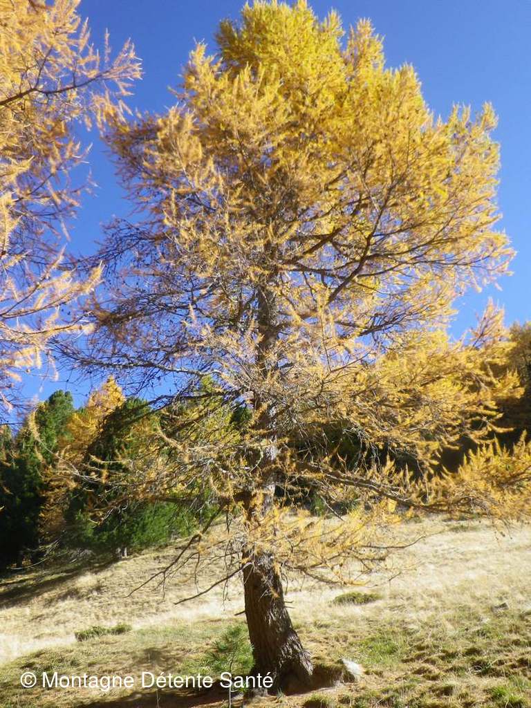 Plus communément appeler « Mélèze d’Europe » , de la famille des Pinacées, il a la particularité de perdre ses aiguilles à l’automne dans une symphonie de couleurs allant du jaune au brun.