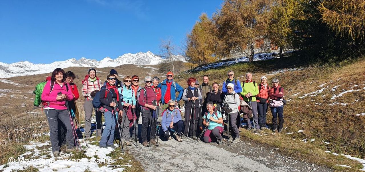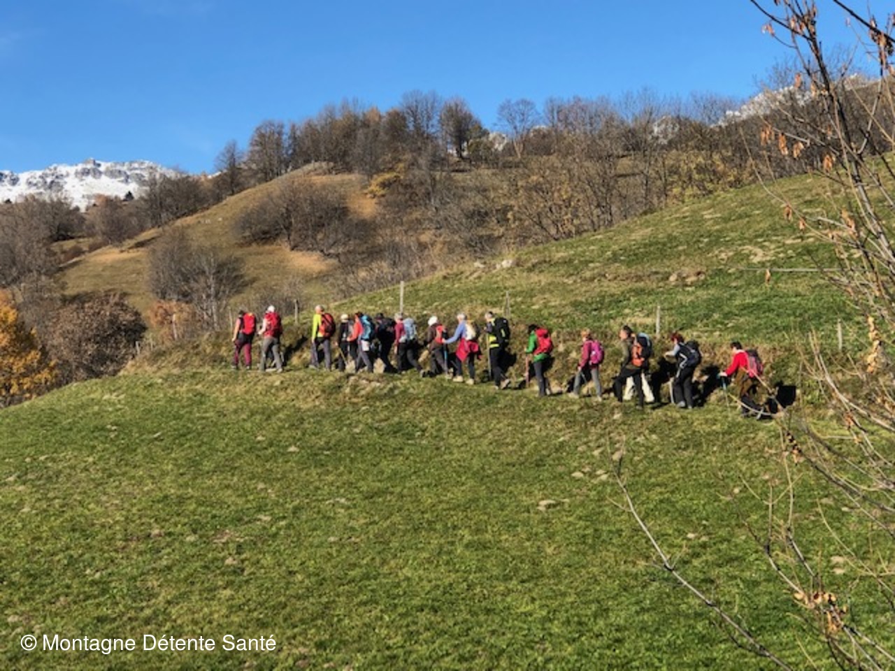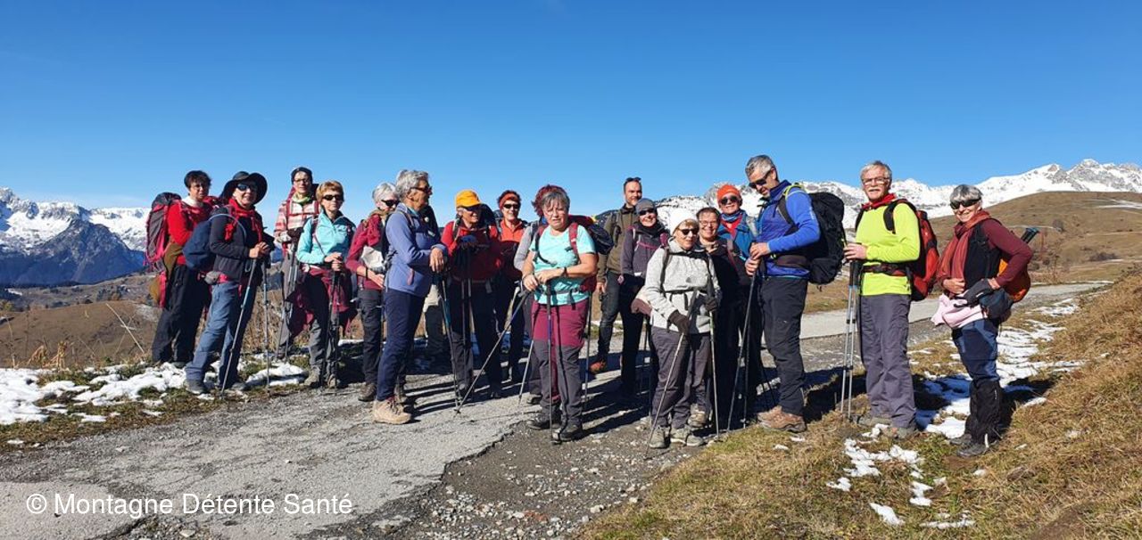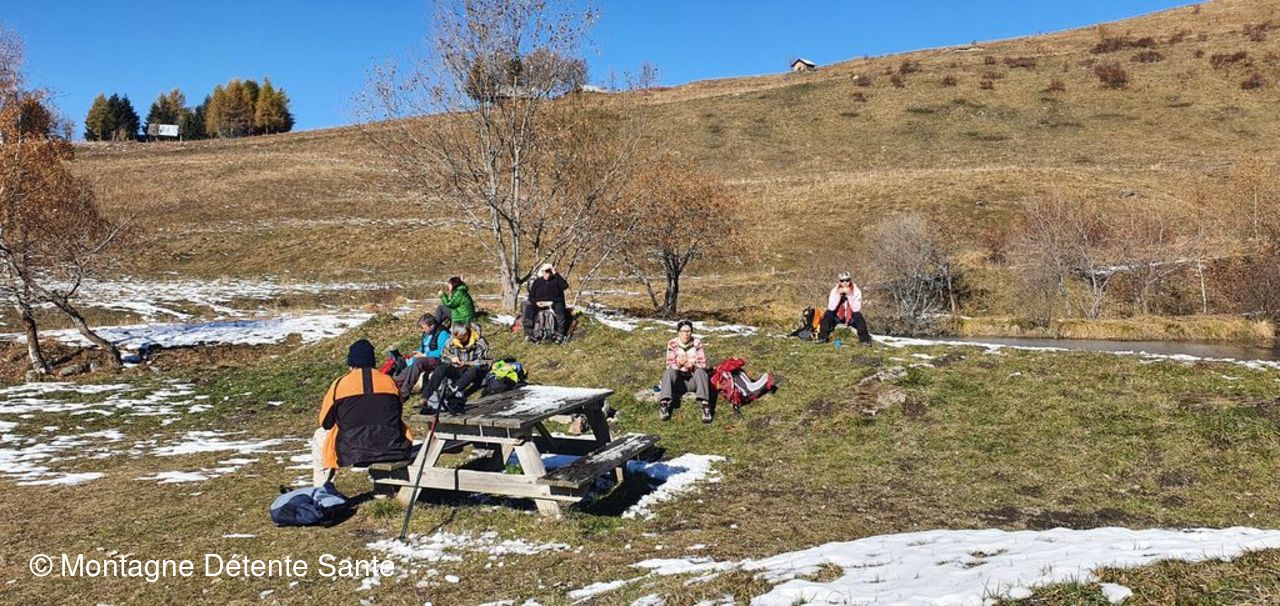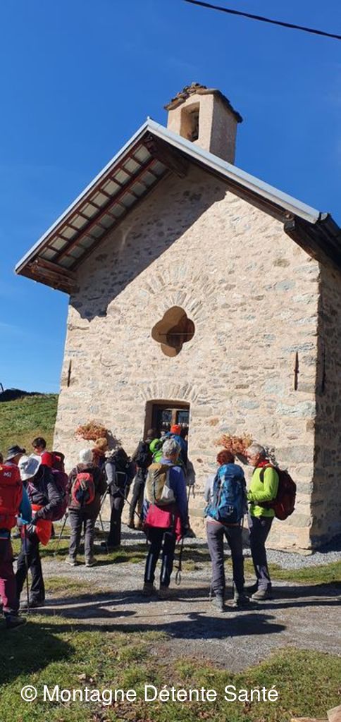 Il faisait frisquet au départ de Montaimont ce matin, nous nous sommes réchauffés en marchant puis une fois au soleil, la journée a été très agréable. Nous sommes partis par le col de Champfol, magnifique belvédère sur la vallée (double table d'orientation), le village et ses hameaux, sur les sommets des Belledonnes, de Maurienne (aiguilles d'Arves, Etendart, ...) ; nous avons rejoint le hameau de la Perrière par la crête qui nous permet une belle vue sur la Lauzière, sommes montés progressivement en passant par les Ramées avant d'atteindre notre point haut du jour : la chapelle Ste Marguerite (1650m), photos de famille devant les Belledonnes et un bouquet de mélèzes qui ont encore gardé quelques aiguilles. Pause repas un peu plus bas au bord de 3 jolis petits lacs, nous avons poussé la neige pour nous asseoir, température idéale, sans vent. Descente tranquille par la route jusqu'au lac, puis le village du Loup en admirant le paysage. Avons cherché à connaître le Saint patron de la chapelle du Loup, accompagné d'une drôle de bête (dragon, mouton ? ...), St George ?, sans certitude. Belle descente par les hameaux (Taramur, les Bigots, la ville du Nant) jusqu'à Montaimont, arrivée au parking à 15h. Tout le monde a très bien marché, belle journée pour tous, beaucoup d’échanges entre les participants.