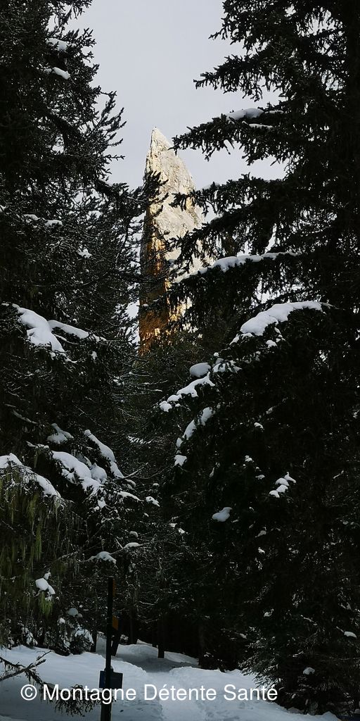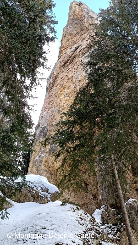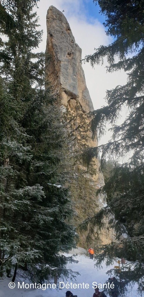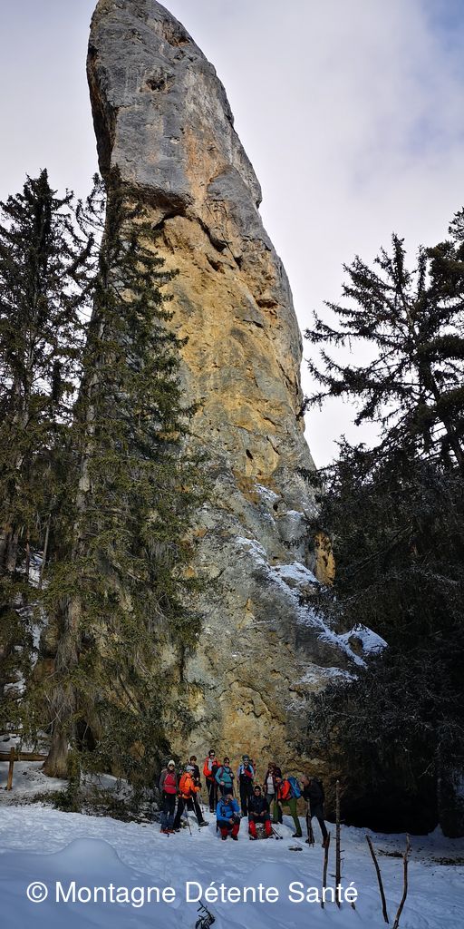 Et pour finir en beauté, une petite visite au monolithe de Sardières s’imposait. Prévue le lundi, mais empêchée par la Grande Odyssée, cette sortie nous a fait découvrir pour certains, sinon voir dans d’autres condition cette bizarrerie géologique. La fine couche de neige tombée dans la nuit ne justifiait pas l’utilisation des raquettes, c’est donc avec les crampons que nous sommes montés.