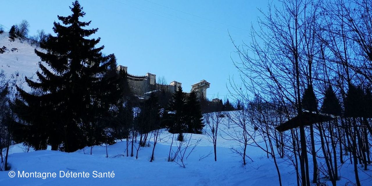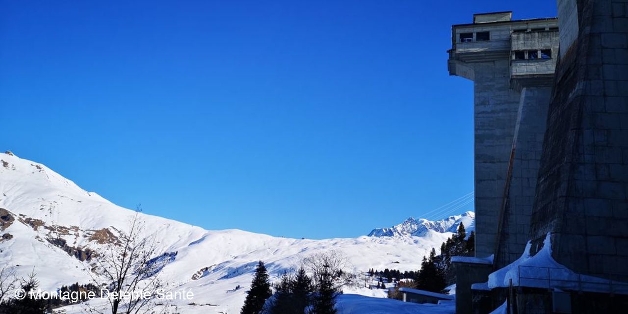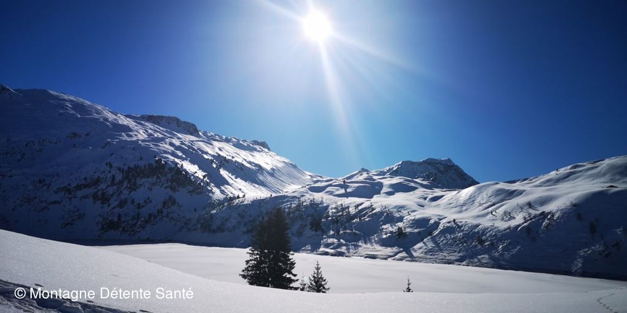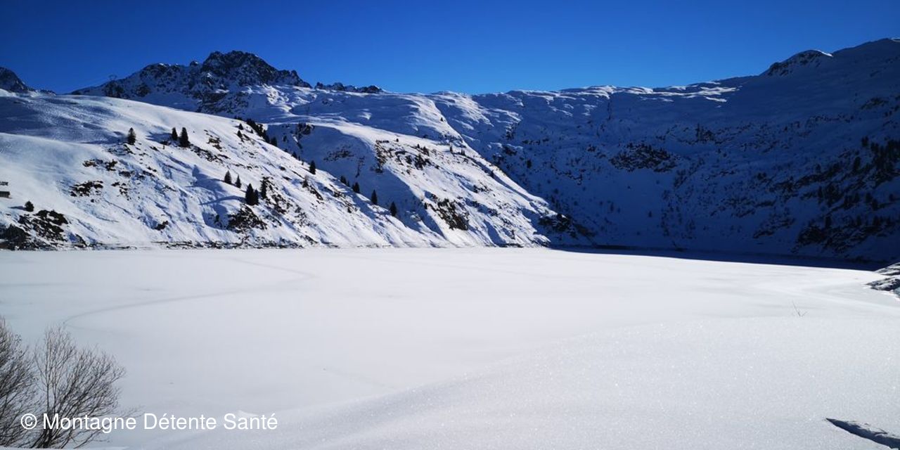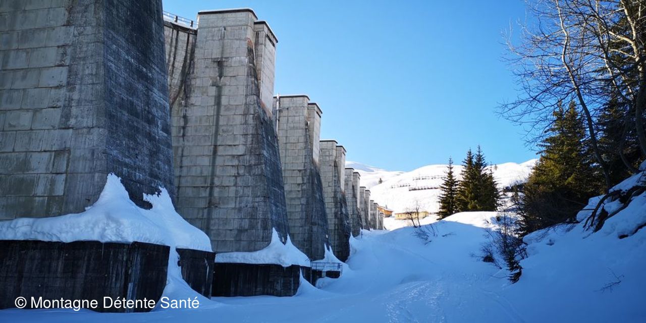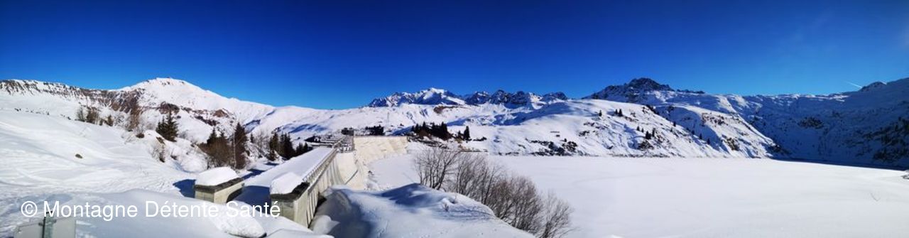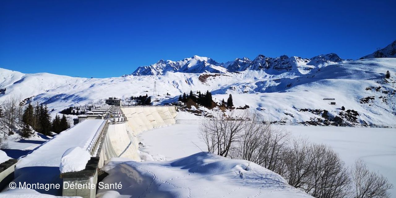 Vue grandiose sur le Mont Blanc et le lac de retenue entièrement blanc lui aussi !