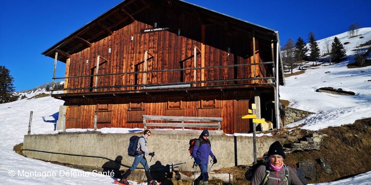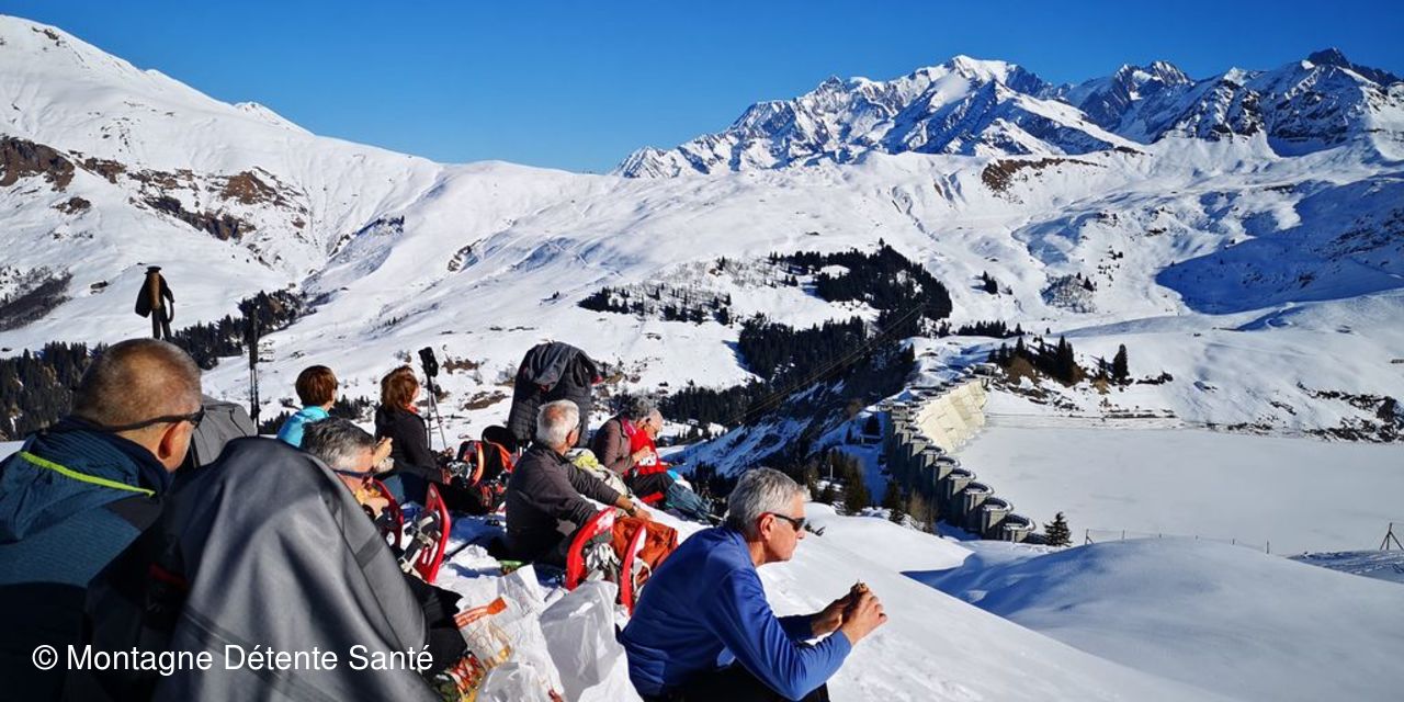 9 participants ne se sont pas laissés impressionner et au départ du parking de Belleville se sont lancés à l’aventure. La trace peu faite s’est vite estompée et nous a forcé à monter le long de la piste de ski. Pente très raide, mais au moins nous accrochons… Un groupe de ski de rando en faisait autant. Après le pont sur le Dorinet, plus de trace… Nous nous engageons et retrouvons des passages de skieurs qui nous permettent tant bien que mal d’attendre le barrage. Nous le contournons pour être au soleil et continuons encore un peu vers une crête pour le casse croûte qui devenait urgent.