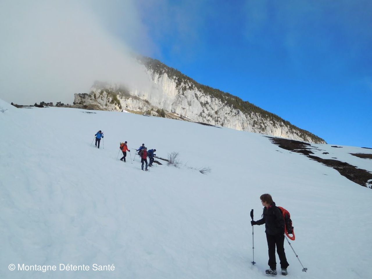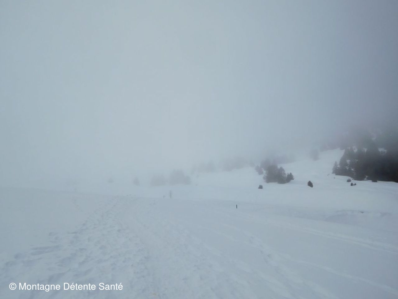 Bien froid en vallée mais le thermomètre grimpe en même temps que nous et nous commençons la rando par température fraîche, mais sans plus et au dessus de la brume. La montée au col de l’Alpette est super bien tracée et les crampons nous aident à arriver au col facilement. Quelques nuages en ont profité pour se former et s’accrocher au sommet du Granier. Au sortir de la forêt, surprise, la brume est là. Presque jour blanc ! A l’arrivée au Habert de belles trouées se forment. Et nous voyons deux randonneurs laisser leurs sacs un peu plus bas et venir à notre rencontre : Alain et Christine étaient dans le secteur. Nous continuons ensemble, cette fois avec les raquettes, pour le casse croûte à La Croix de l’Alpe. Ils continueront ensuite leur chemin et nous, nous redescendons avant de tenter une montée vers les crêtes. Mais les traces ne sont pas encourageantes et nous repartons vers le GR et le col pour une descente vers le parking.