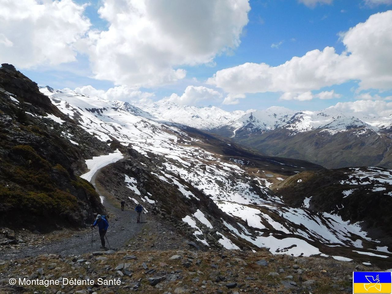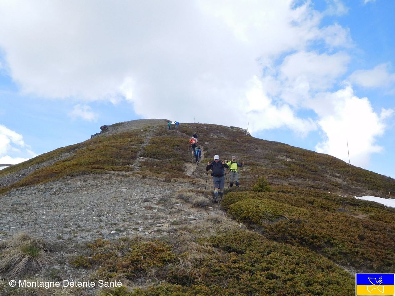 11 randonneurs s’élancent donc du parking de St Marcel vers ce sommet en se demandant si la neige serait une gêne là haut ou pas. Montée tranquille vers le pas de Cherferie en suivant tantôt la piste, tantôt en coupant les lacets. Et la neige est là sur les derniers mètres avant le pas si bien que l’on se pose la question de continuer ou pas.