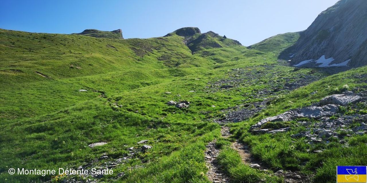 Connaissant le chemin de gauche, je trouve que celui de droite est plus confortable. Erreur, c’est carrément le lit du torrent, il ne faut pas beaucoup se baisser pour toucher le sol… Dans un dernier effort, le collet est franchi et voilà le chalet de Sur le Freu. Nous allons maintenant à la rencontre de ceux qui avaient fait la Tête d’Orsière pour revenir ensemble au refuge.