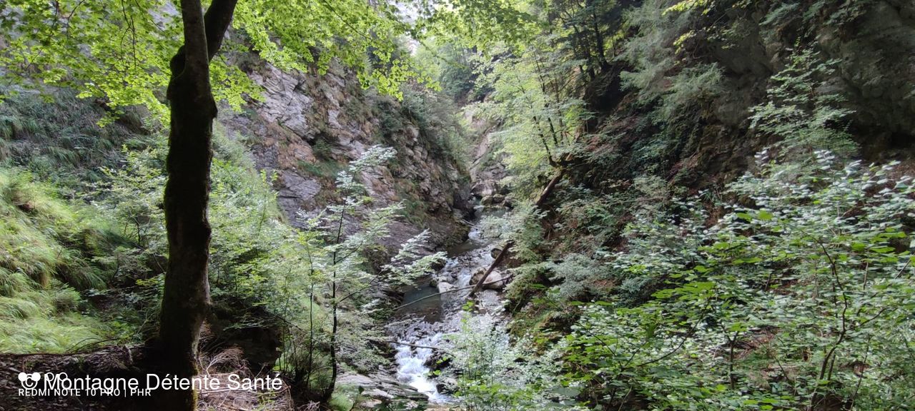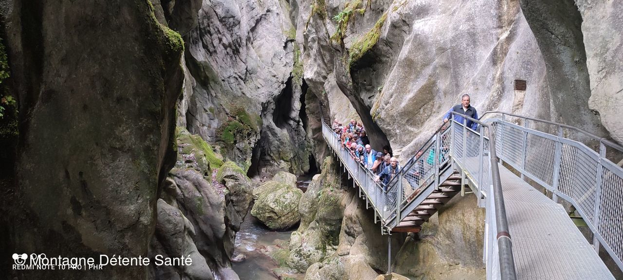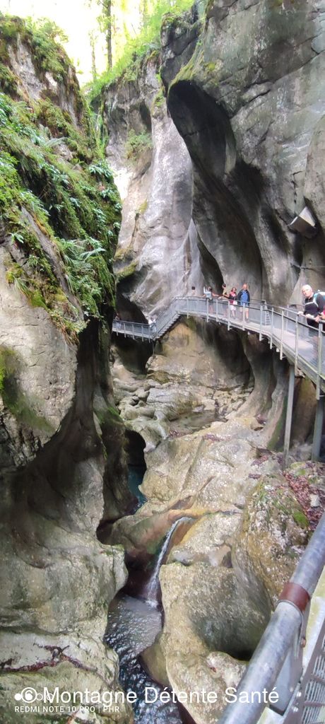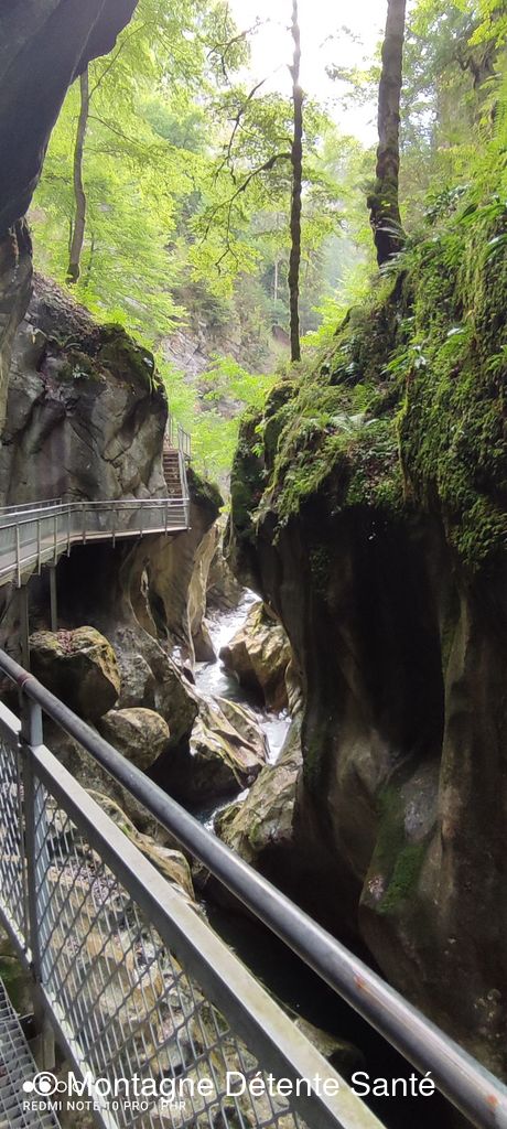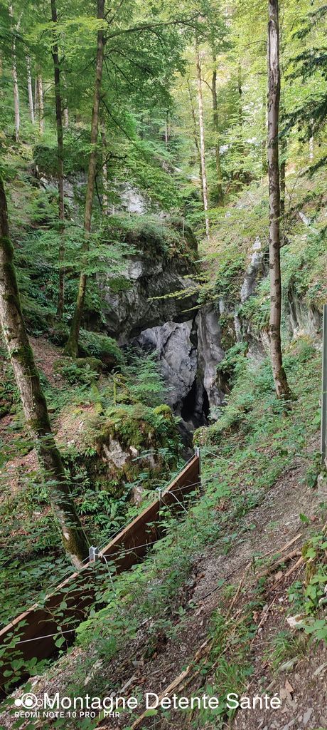 Nous partons pour le Pont du diable pour la visite guidée des gorges de la Dranse d'Abondance. Nous descendons vers le gouffre infernal par le parc forestier du site où de majestueux hêtres se hissent à plus de ??? de hauteur. Nous trépignons d'impatience d"Oser le pas du diable" comme nous y invite le slogan du site. Guillaume, notre guide, surgit enfin pour nous ouvrir la porte de l'enfer : gorges-gouffre-chaos creusés par la Dranse dans le calcaire, que l'on nomme ici le marbre de Laverne. Aménagé pour les curieux dès sa découverte en 1840, le site a été totalement remodelé récemment afin de permettre aux nombreux visiteurs d'admirer en toute sécurité le travail des eaux, les marmites de géant, les deux ponts du diable et les yeux de Lucifer ... La légende veut en effet que celui-ci surveille encore les passants pour se venger de ces paysans qui l'avaient berné : "Je vous donne un pont contre l'âme de celui qui l'empruntera le premier" tel était le marché conclu. Une fois le pont posé, les paysans lui donnèrent.... une chèvre.