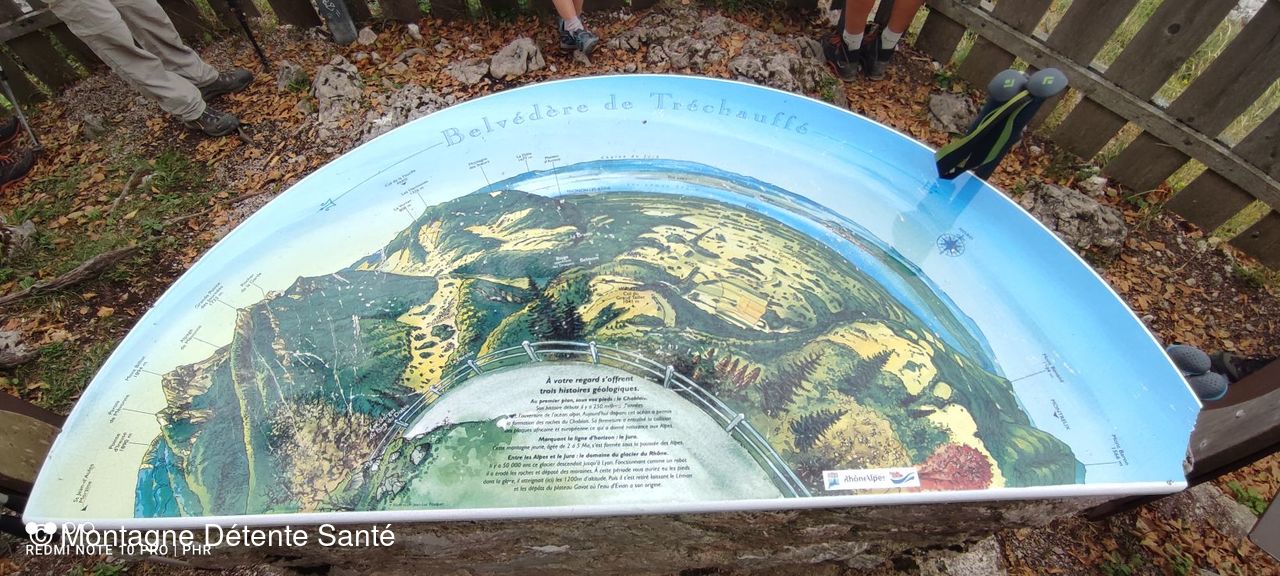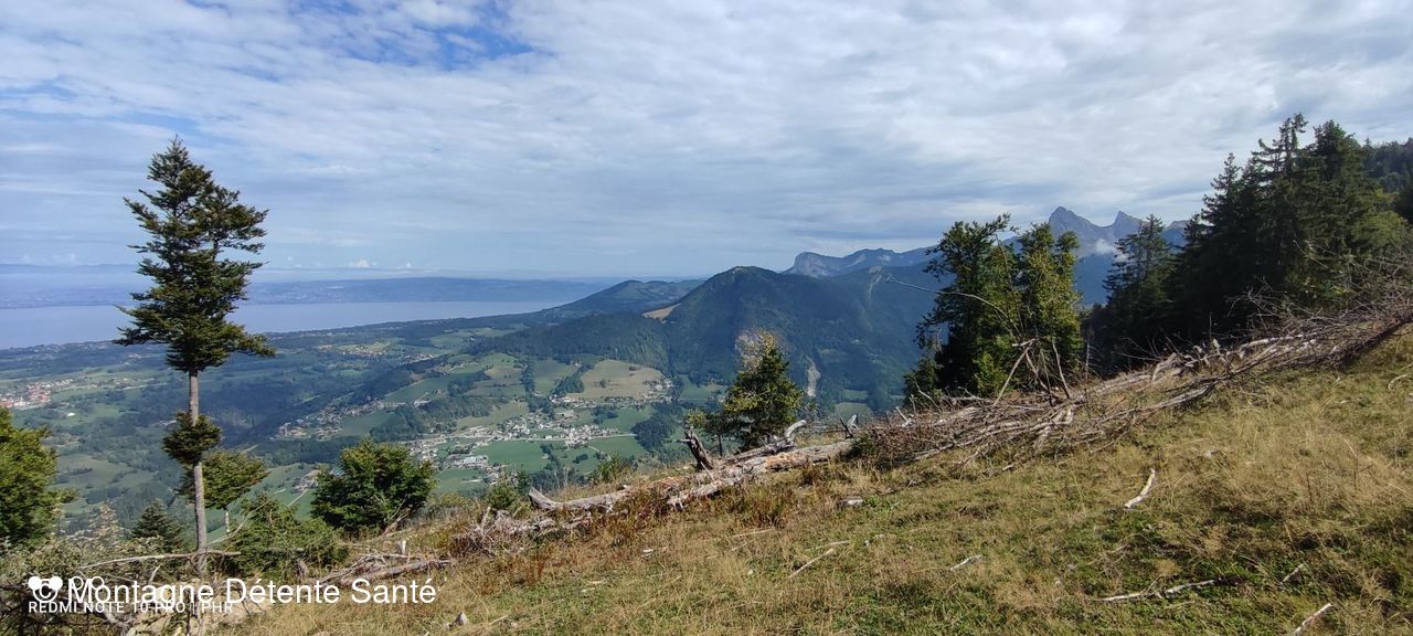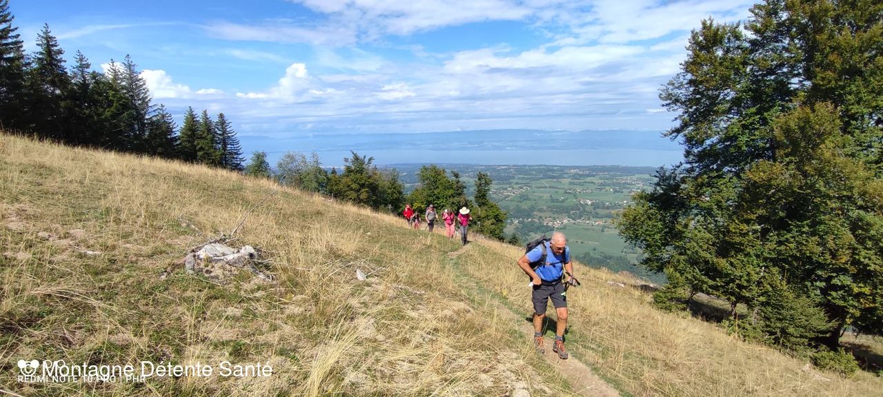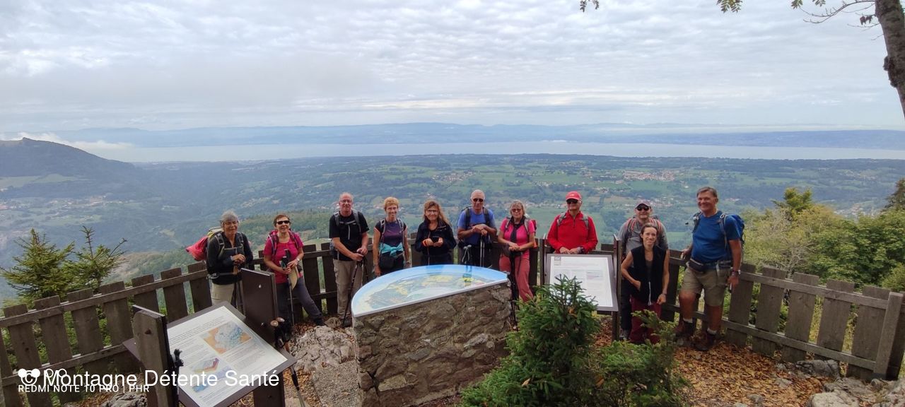 Ça grimpe, ça monte, parfois à travers bois. Soudain, le terrain pentu se fait glissant et la perspective de redescendre par la même voie effraient certains déjà éprouvés par leur descente matinale aux Enfers. Le G. O. Philippe R. propose alors de rester à l'arrière avec eux. Les autres cheminent vers le magnifique panorama final sur le Léman, Thonon et les montagnes du Chablais, les monts du Jura et Lausanne du côté suisse. Bref...le paradis.