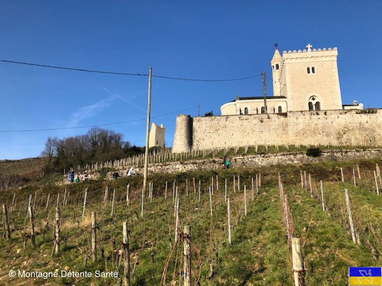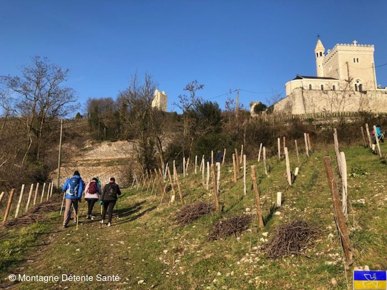 La reprise s'effectue par le chemin de la Ramée, puis par le chemin de Carette pour atteindre la RD 1006 que nous traversons par le tunnel de passage du corridor biologique de nos deux parcs naturels voisins. La colline des Tours de Chignin est en vue. Nous prenons le chemin des pélerins pour arriver à la tour-chapelle de La Biguerne si belle car dernièrement restaurée grâce aux fonds de la mission Bern. Nous contournons le Clos St Anthelme et par les sentiers des vignes nous traversons le hameau des Tours et poursuivons par les hauteurs du hameau de Montlevin pour arriver par un chemin boueux à La Boisserette. Ce sera notre dernière halte avec un soleil qui s'est couché.