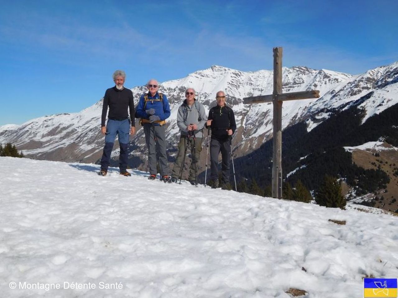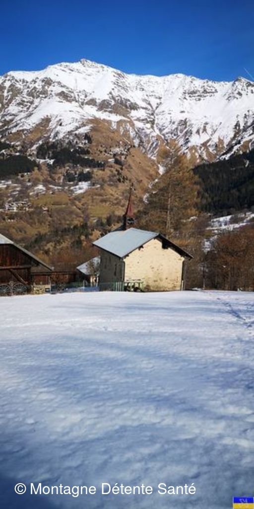 Mais, quel bonheur d’arriver à La Croix de la Chalp et de découvrir ce 360° : Lauzière, Thabor, Cerces, Ecrins, Belledonne, Bauges et j’en oublie. Repas et repos furent aussi les bienvenus. Puis, descente plein Nord. Heureusement que des traces de raquettes ont bien damé un chemin car les quelques 200 premiers mètres dans une bonne épaisseur de neige qui se transformait n’auguraient rien de facile pour cette descente. Pour faire une boucle la plus large possible, le retour se fait par les hameaux des Mottes et des Rieux.