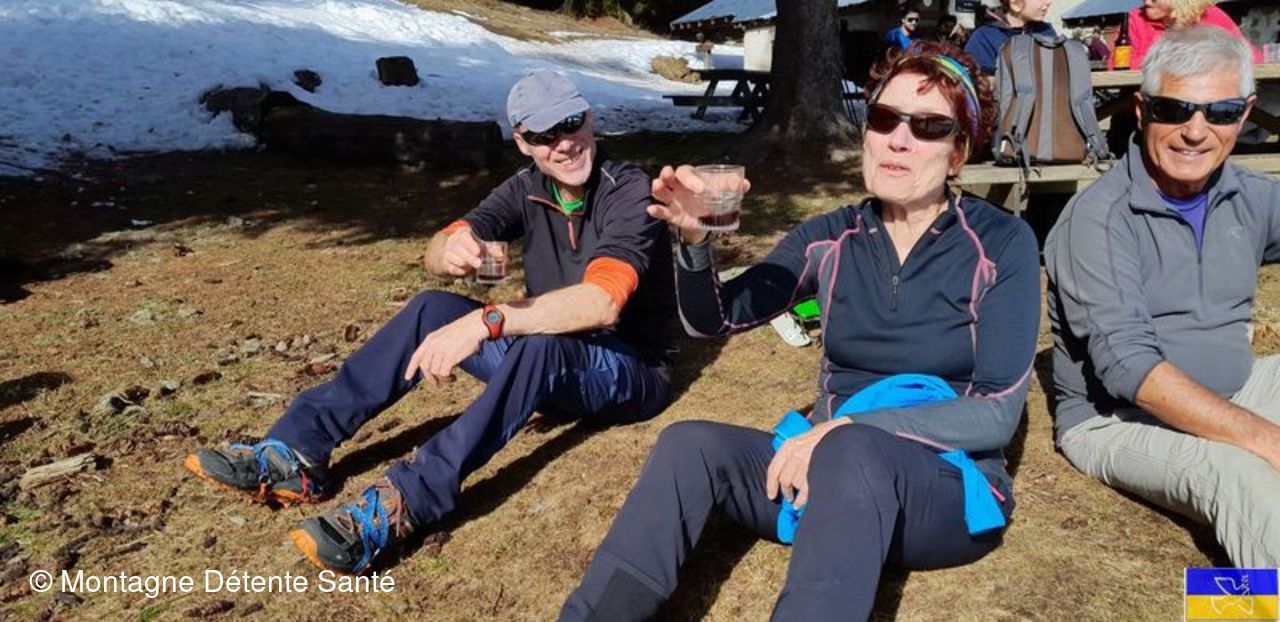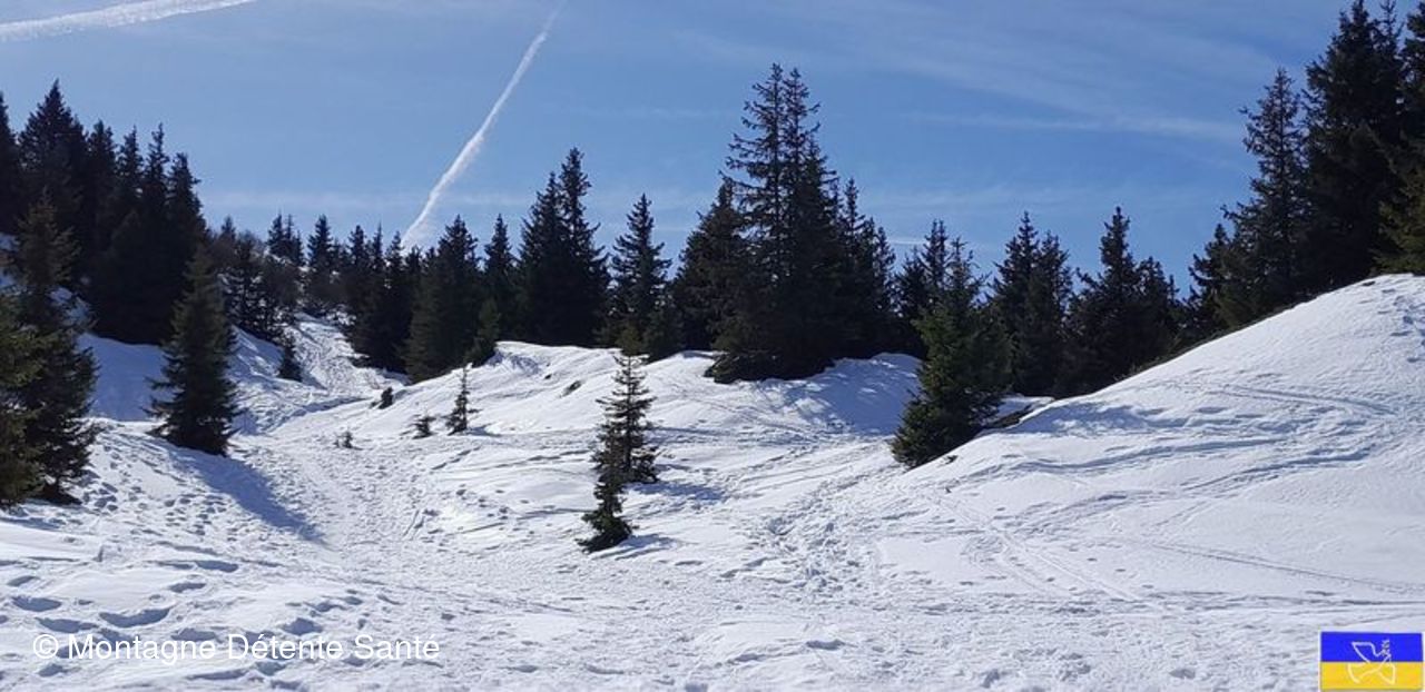 Nous entamons le parcours dans la forêt, la neige est tassée et dure, nous apprécions les crampons qui nous permettent de marcher en toute sécurité et sans difficultés. Aux chalets de Pierre Roubet, une grande clairière ensoleillée se présente à nous, il fait déjà assez chaud. Nous poursuivons notre cheminement et traversons les pistes de ski de fond situées à plus de 1 800 m d’altitude. On y aperçoit d’un côté la ville de Grenoble et de l’autre Chambéry et le lac du Bourget.