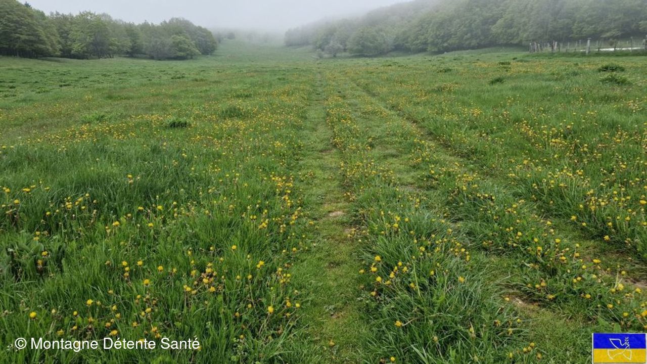 Nous suivons un chemin d'alpage au milieu d'un immense champ de pissenlits en fleurs.