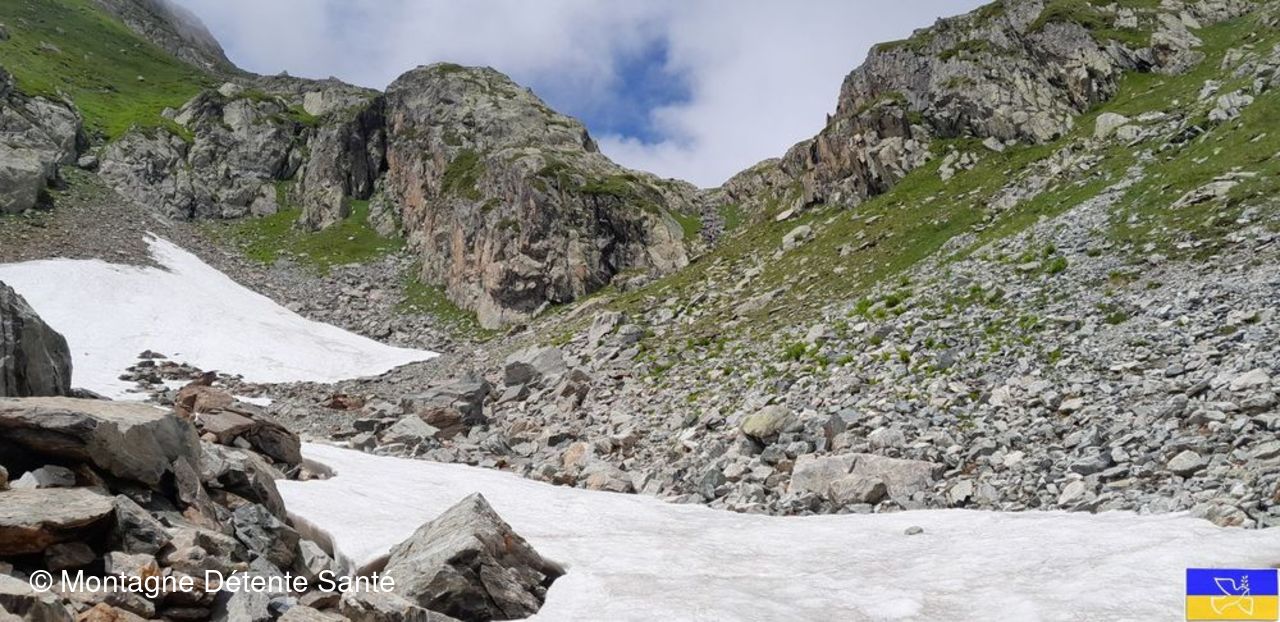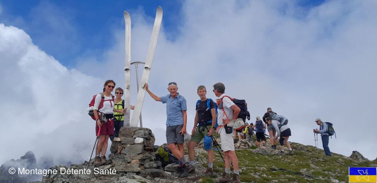 Notre point de départ se situe sous col du Glandon. Dès le début la pente est assez prononcée mais la brume encore présente nous permet de rester au frais. Nous traversons la passerelle Maurice Bozon pour bifurquer en direction de la Cime du Sambuis, les torrents coulent à flots. Le sentier s’adoucit un peu, nous passons à proximité d’un joli lac. A partir de là, la pente s’accentue fortement mais l’ascension s’effectue sans grosses difficultés. Nous observons plusieurs bouquetins qui se promènent sur les crêtes. Au sommet, nous admirons le surprenant totem des Villards fait d’une paire de ski métallique pointée vers le ciel avec un piolet au centre. Les nuages encore présents ne nous permettent pas une bonne lecture du paysage.