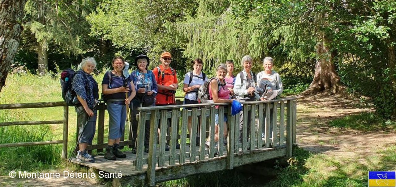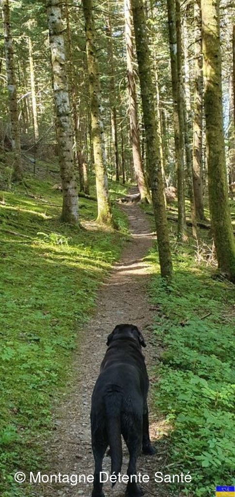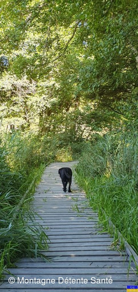 Départ du parking du foyer de ski de fond à 9h15, nous avons emprunter le «circuit des chevaliers de l’Huile», chemin d’histoire avec plusieurs tableaux explicatifs. Plusieurs chiens nous proposent de nous accompagner ; fermement nous les avons informés que les chiens ne sont pas les bienvenus en rando santé. Lindt a décidé de nous accompagner quand même, en proposant de se tenir en tête et de nous montrer le chemin …