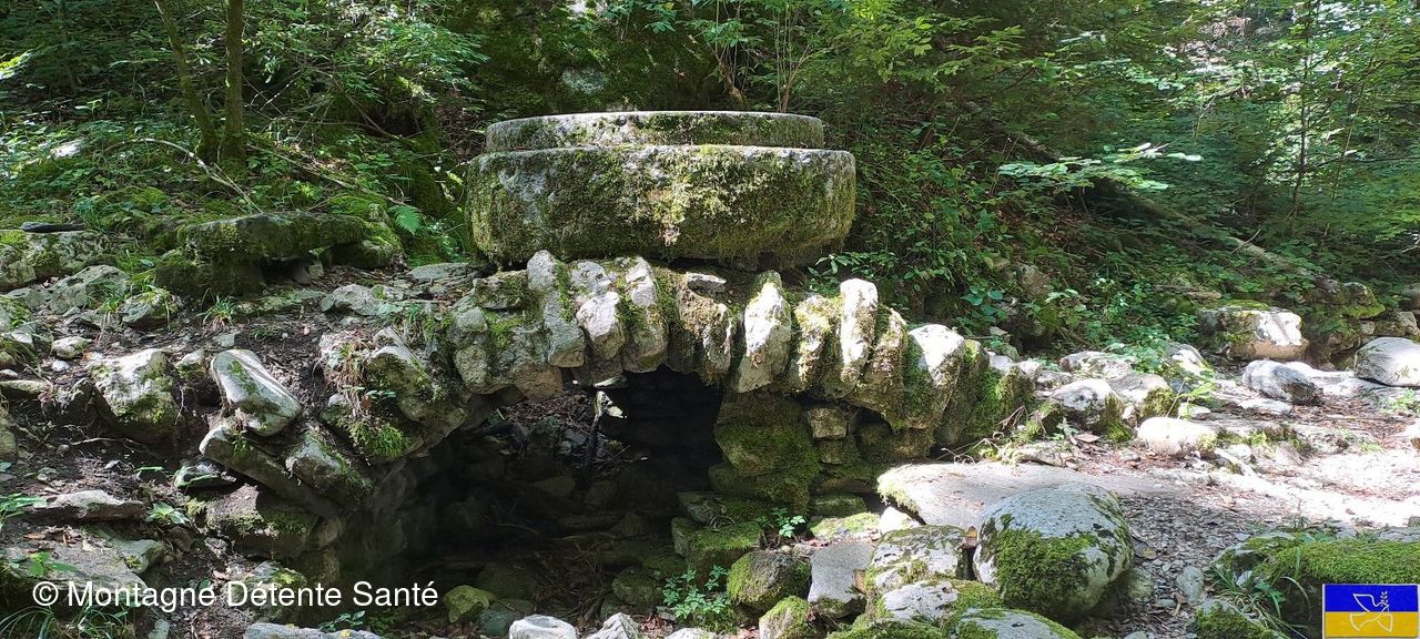 Nous prenons à droite en direction de l'office du tourisme. Nous passons à droite par le Chemin du Pal de fer et contiuons tout droit sur le Chemin de la Chapelle. Nous passons au dessus du décollage sud où de nombreux parapentistes gagnent les airs pour jouer dans les thermiques qui montent de la plaine. Nous arrivons bientôt sur l'Oratoire de la petite chapelle (19è Siècle). Nous prenons le Chemin à droite qui longe la falaise, passe des prairies et gagne la foret. Nous le suivons jusqu'au vestiges du Moulin de Porte Traine.
