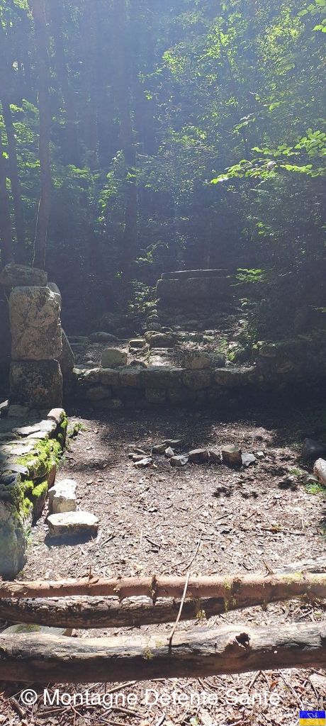 Nous profitons de la fraicheur et de l'ombrage de la Forêt de feuillus pour faire la pause casse croute. Après quoi, nous entamons la remontée vers le plateau par le chemin qui mène à la Cascade des Dioux. Nous n'y descendons pas et continuons jusqu'au croisement avec le Chemin des Massards. Nous allons à gauche par le Chemin des Dioux jusqu'au hameau des Vials. Nous prenons à gauche le Chemin des Vials puis à gauche le Chemin des Gaudes. Nous arrivons bientôt sur l'Oratoire puis revenons en direction du parking.