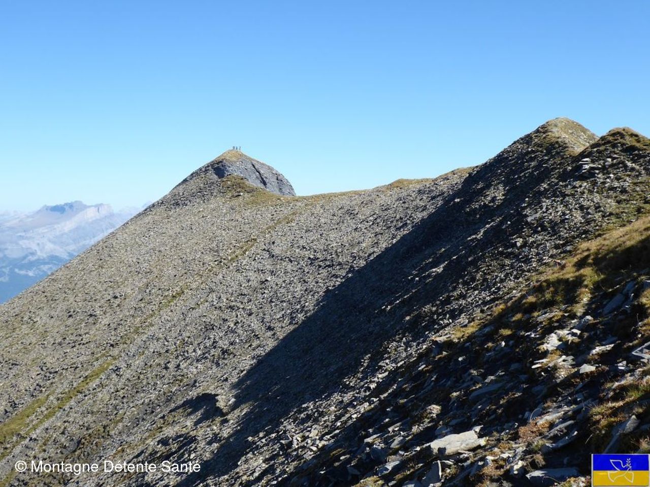 De suite depuis le col du Joly, la montée est assez raide jusqu'à l'aiguille croche. Là-haut, c'est un panorama 360°, avec le massif du Mont-Blanc qui ne nous quittera pas de la journée, mais aussi le Beaufortain, la Vanoise, les Bauges et les Aravis. Cette première pause terminée, nous reprenons le sentier qui jusqu'au Mont Joly se fera par les crêtes, d'abord par la Tête du Véléray puis par la Tête de la Combaz.