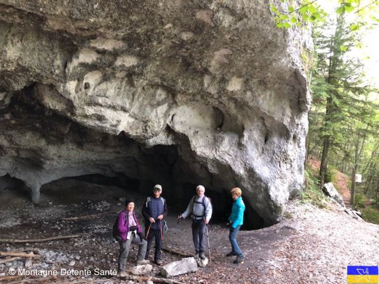 Petit retour en arrière pour prendre le chemin transversal du bas de la montagne en direction du Col St Michel par sa face sud en suivant l'itinéraire de la voie romaine nous faisant découvrir les grottes François 1er. Selon la tradition, le 10 juin 1516, le grand roi aura passé une nuit d'orage avec sa cour et le chevalier Bayard à l'abri de ces grottes sur sa route du retour vers Lyon. Arrivés au Col St Michel (915 m) à la pause méridienne, après avoir vu le sarcophage et les ruines du Prieuré St Germain, nous décidions de quitter les lieux à l'ombre et ventés pour retourner à nouveau au Col du Crucifix, beaucoup plus ensoleillé par le sentier de la Crête. Un nouveau panoramique du Lac d'Aiguebelette s'offre à nous, il nous a permis de vérifier la couleur émeraude de ses eaux.