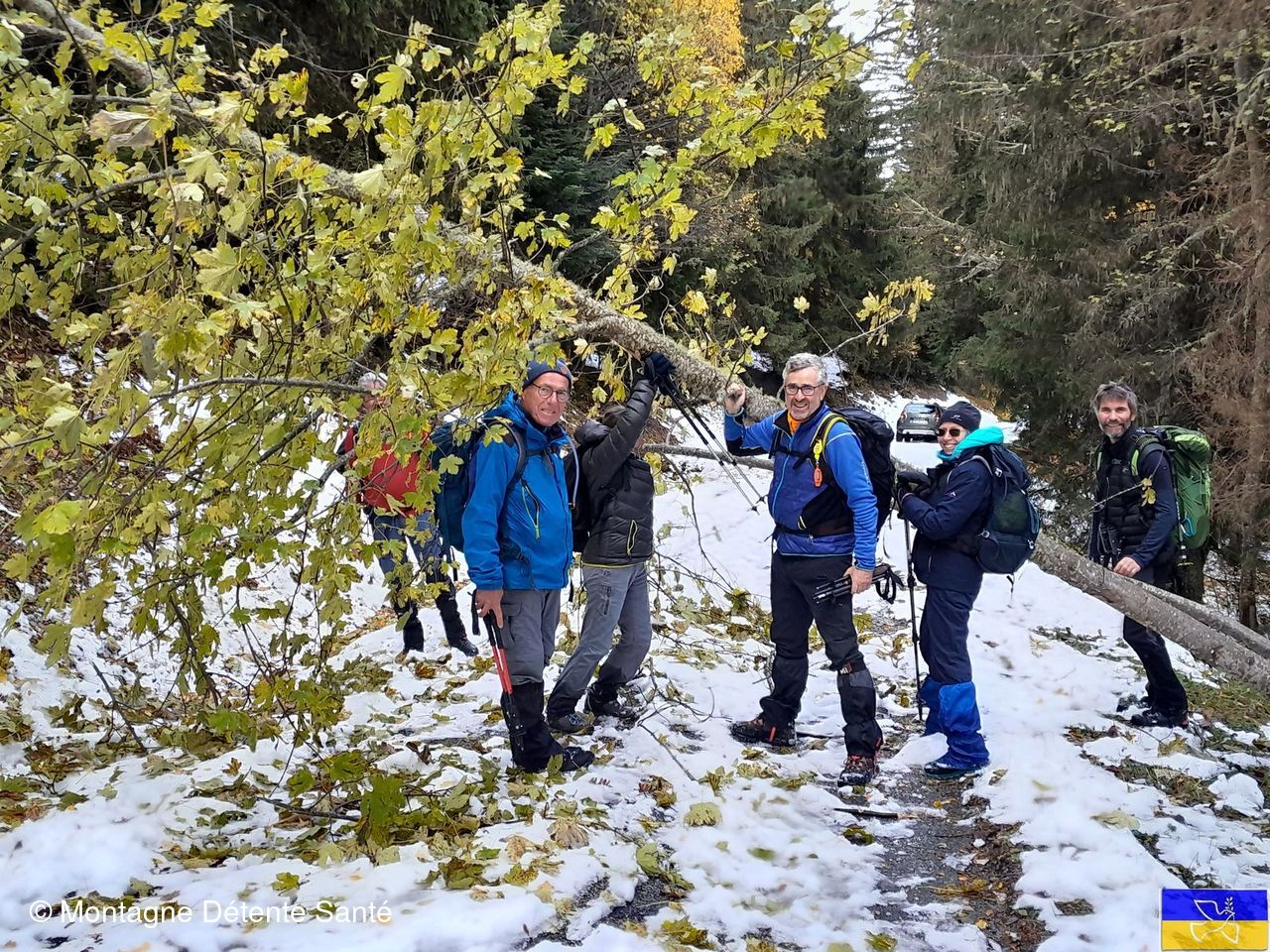 Nous sommes allés au-delà du col du Grand Cucheron pour débuter notre balade. Avec les voitures, nous contournons plusieurs arbres tombés sur la route d’accès (poids de la neige) mais nous sommes stoppés par l’un d’entre eux peu avant le parking.