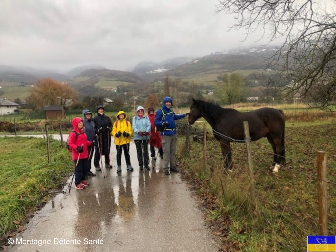 Nous continuons par le chemin de La Ratte avec un passage devant le bâtiment du 'Granier des Possibles' accueillant de multiples activités, traversant au sec le Marais du Chêne pour atteindre le chemin de Capadieu qui nous amena au golf d'Apremont. Nous en effectuons gaillardement le tour. Nous n'apercevons sous la pluie, qu'un seul golfeur au practice et revenons sur la RD 201. Nous l'empruntons jusqu'au carrefour du chemin de la Caspienne (la fameuse voie verte menant les cyclistes chambériens au Lac St André) pour reprendre la rue de Sales et arriver à notre point de départ. A peine trempés, nous effectuons quelques mouvements d'étirements sous un ciel devenu enfin clément.